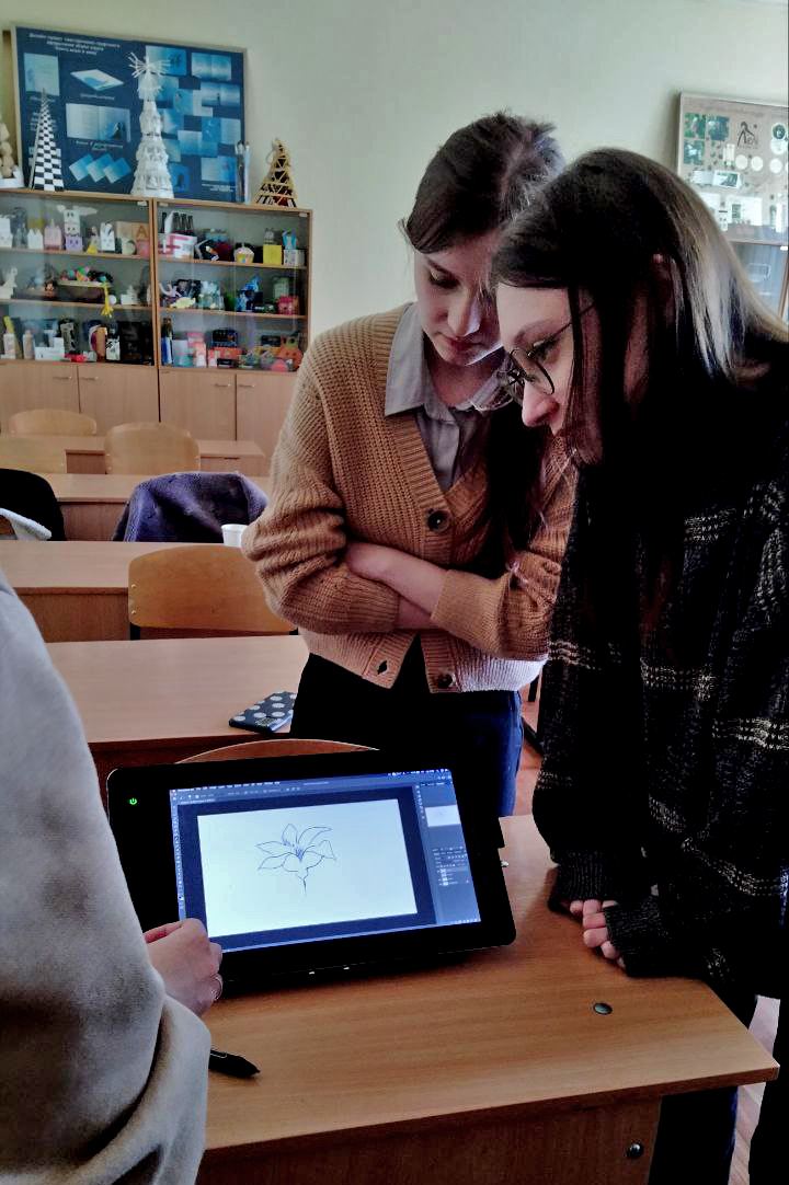 Під час практикуму студентки та студенти мали можливість попрацювати на екранному графічному планшеті, а також створити невеликі власні ілюстрації.
