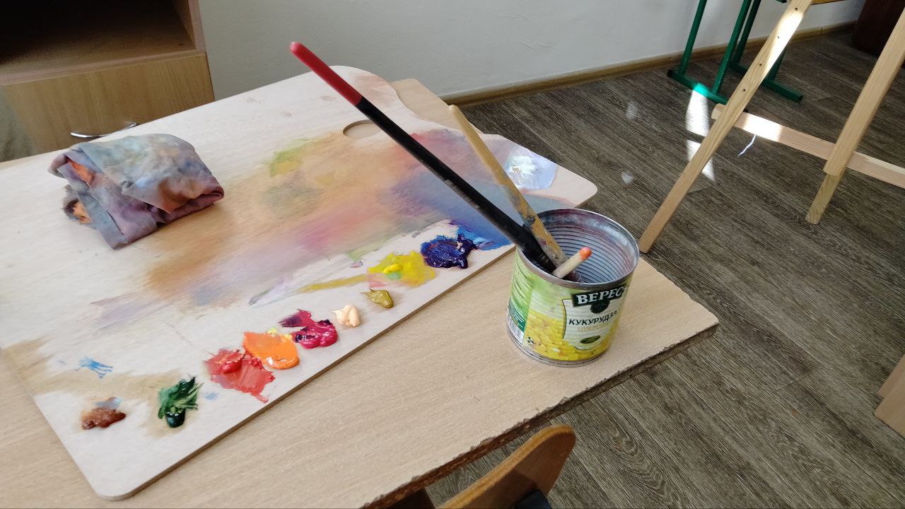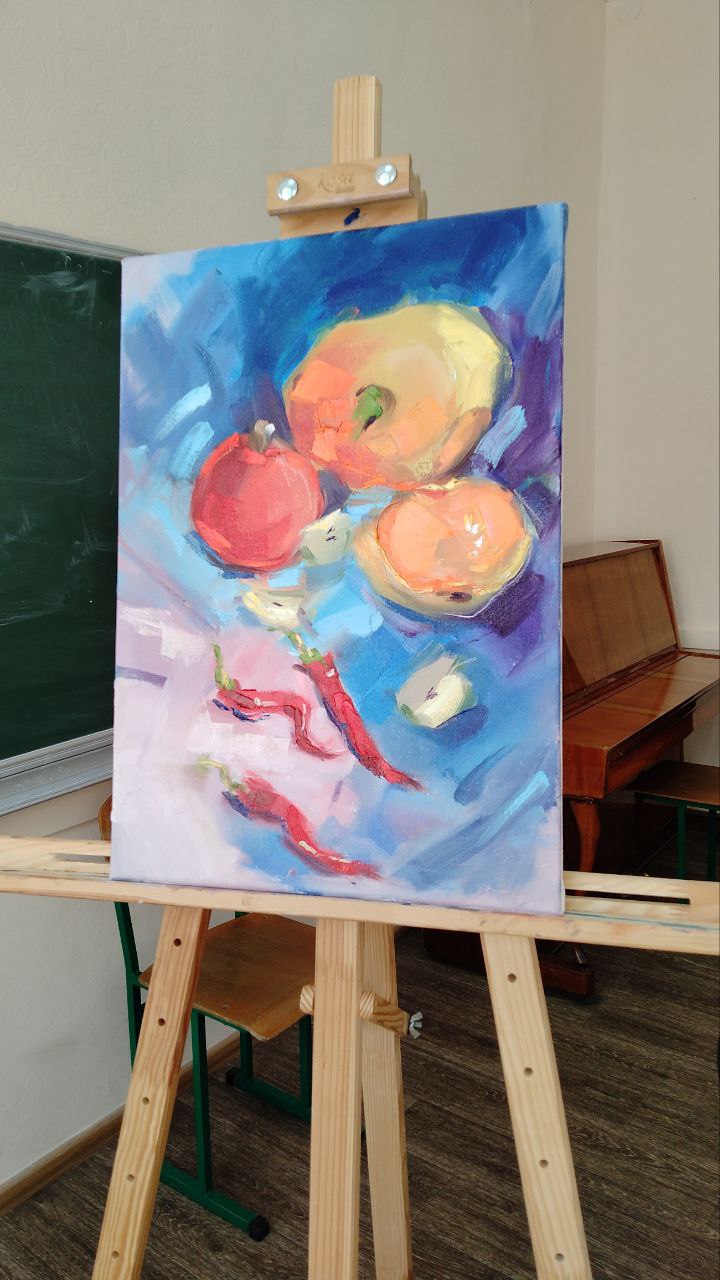 Під час майстер-класу відвідувачки та відвідувачи змогли поставити власну творчу постановку, переглянули особливості композиції з різних ракурсів та побачили процес створення олійного натюрморту “вид зверху”.