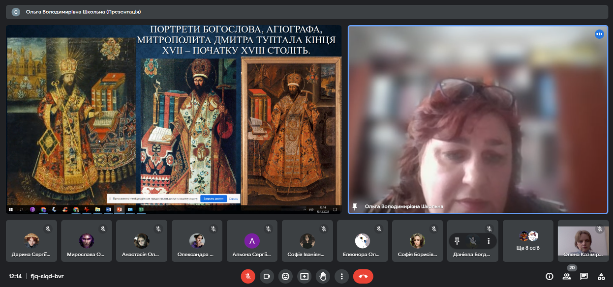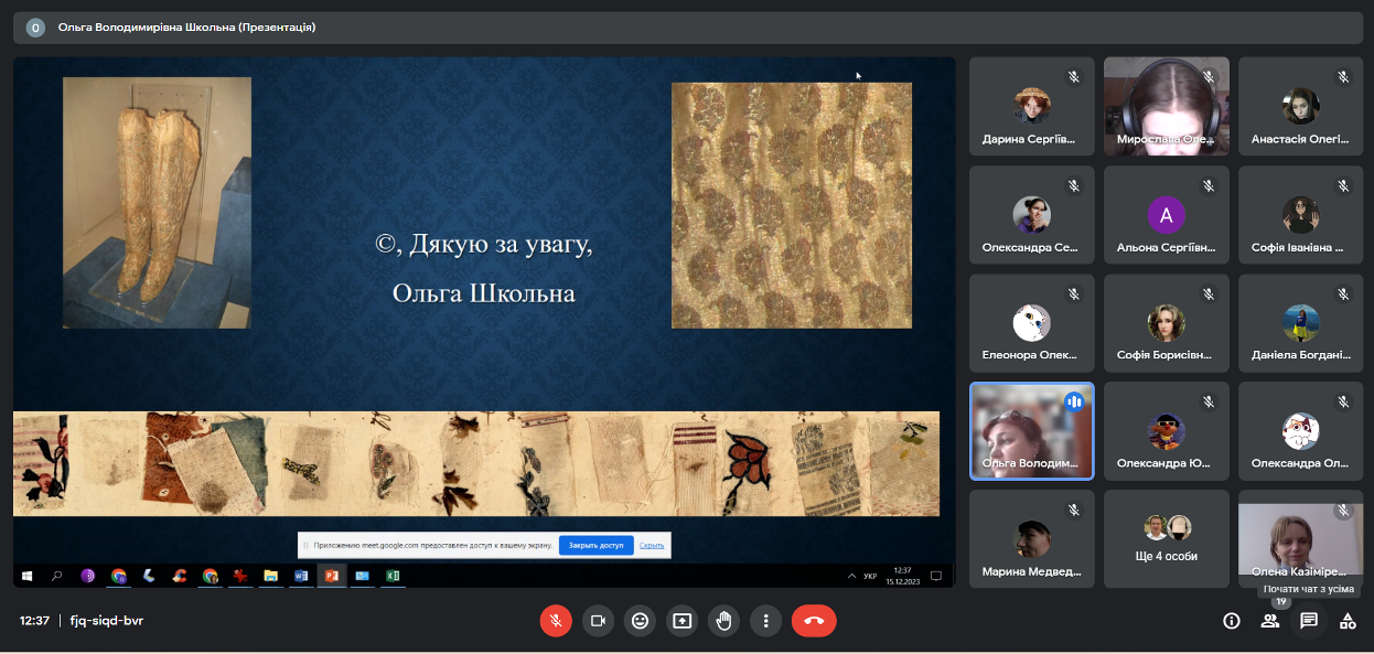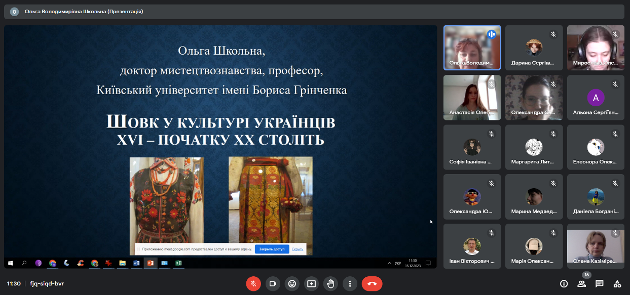 15 грудня 2023 року в межах співпраці з Факультетом образотворчого мистецтва і дизайну Школьна Ольга Володимирівна, доктор мистецтвознавства, професор, завідувач, професор кафедри образотворчого мистецтва Київського університету імені Бориса Грінченка, прочитала для студенток і студентів Фахового коледжу “Універсум” лекцію на тему: “Шовк в художній культурі України ХVІ- початку ХХ століть”.