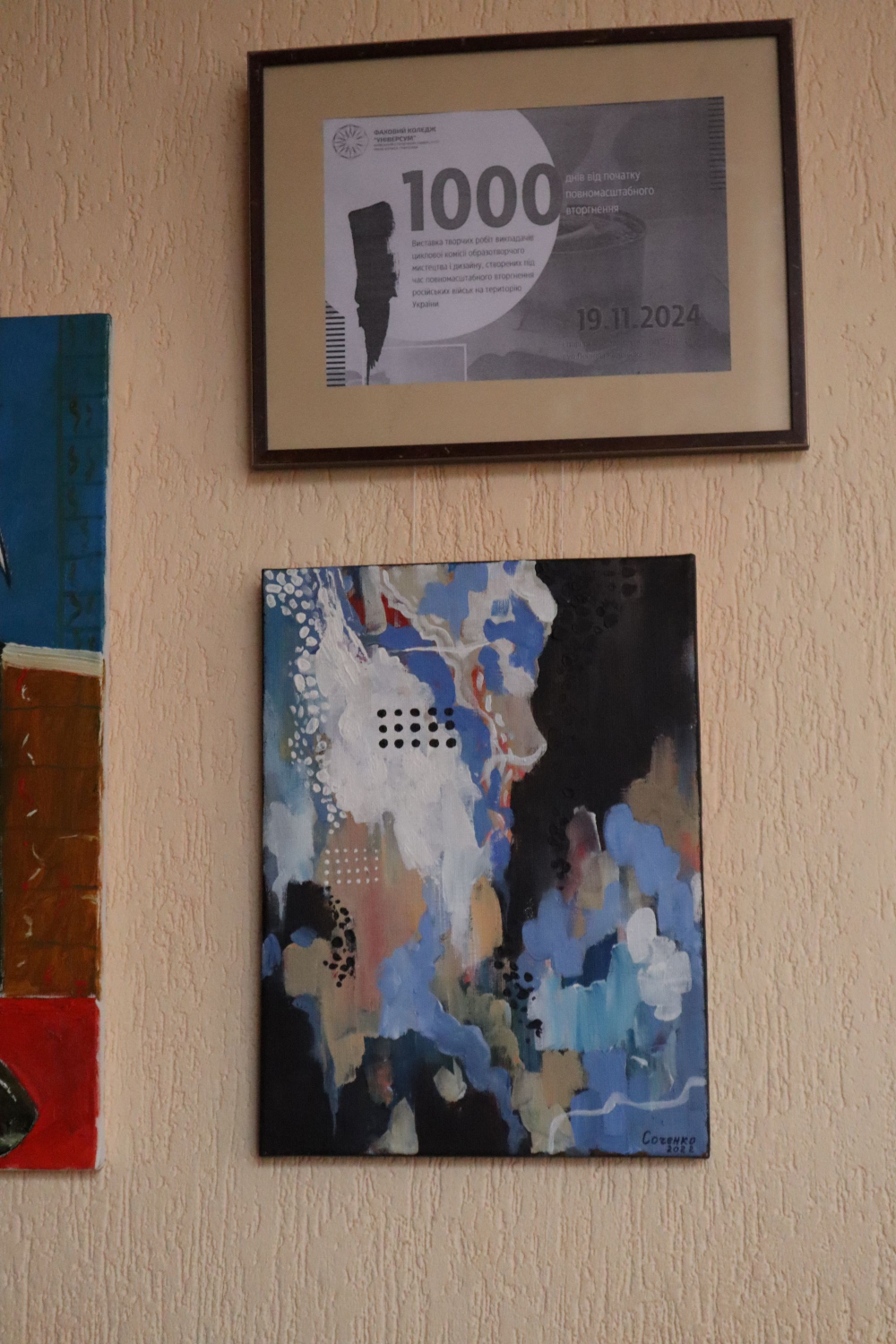 19 листопада 2024 року на першому поверсі Фахового коледжу “Універсум” Київського університету імені Бориса Грінченка, викладачі циклової комісії образотворчого мистецтва і дизайну презентували виставку власних творчих робіт створених під час повномасштабного вторгнення російських військ на територію України “1000 днів від початку повномасштабного вторгнення”