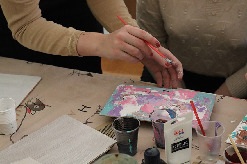 В межах майстер-класу відвідувачі виконали власні творчі композиції в техніці флюід-арту. Фантастичні візерунки утворені рідким акрилом сприяли психологічному розвантаженню, підвищенню стресостійкості та ефективності робочого процесу учасників заходу.