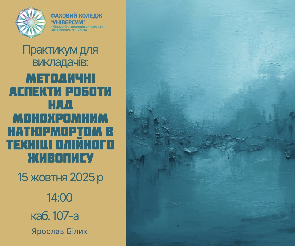 З радістю звітуємо про успішне завершення інтенсивного практикуму для викладачів «Методичні аспекти роботи над монохромним натюрмортом в техніці олійного живопису», що відбувся 15 жовтня 2025 року.