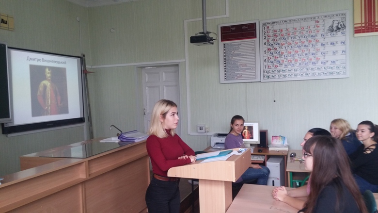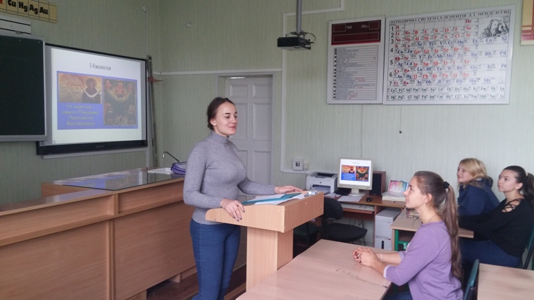 Іванова К., Бутко В. ,Хох Є., Онищенко Д.,Гурина І., здійснили екскурс історичними подіями, пов’язаними з цією датою: день Покрови Пресвятої Богородиці, День українського козацтва, дата створення Української повстанської армії, а з 2014 року - державне свято захисника Вітчизни.
