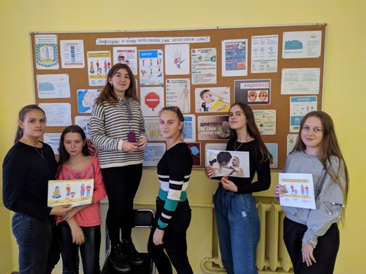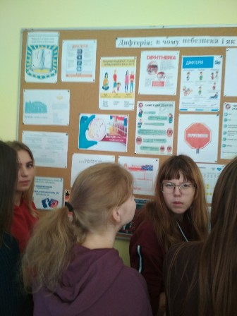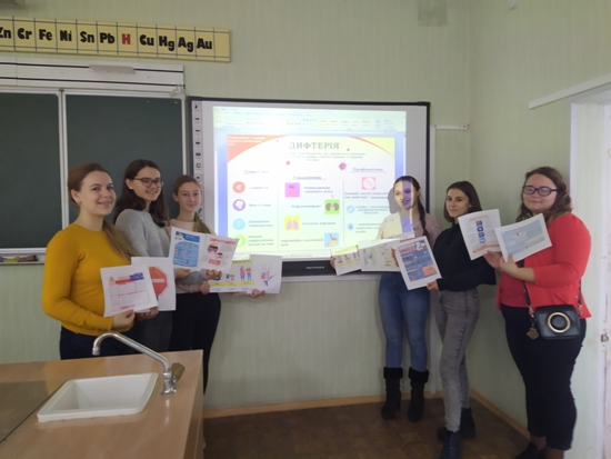 Студенти ознайомились зі шляхами передачі цього гострого інфекційного захворювання, симптомами дифтерії,які характеризуються місцевим фібринозним запаленням (переважно слизових оболонок ротоглотки) та явищами загальної інтоксикації з переважним ураженням серцево-судинної та нервової систем,звернули увагу на можливі ускладнення та важливість вчасно проведених як вакцинацій, так і ревакцинацій.
