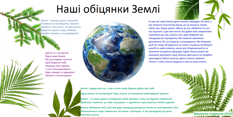 Студенти виготовили плакати до Дня Землі і вивісили у вікнах своїх квартир, а також створили віртуальні картки для соціальних мереж із закликом берегти природу.