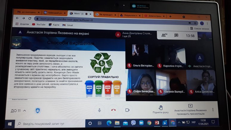 Учасники ознайомилися з причинами зміни клімату, концепціями і принципами сталого (збалансованого) розвитку суспільства. Студенти дискутували і пропонували дієві пропозиції щодо того, як кожен з нас може впливати на екологію планети, презентували одногрупникам свої проєкти відповідно до теми.