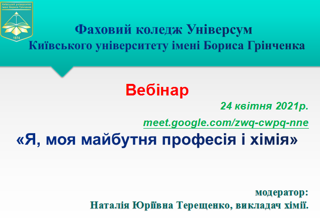 24 квітня 2021 року у Фаховому коледжі «Універсум» Київського університету імені Бориса Грінченка в рамках заходів з нагоди Дня коледжу відбувся вебінар «Я, моя майбутня професія і хімія».