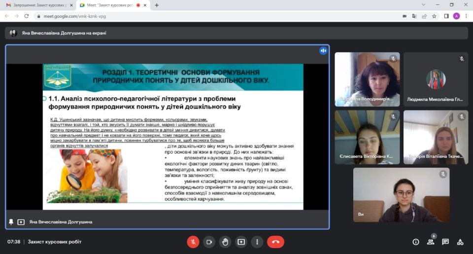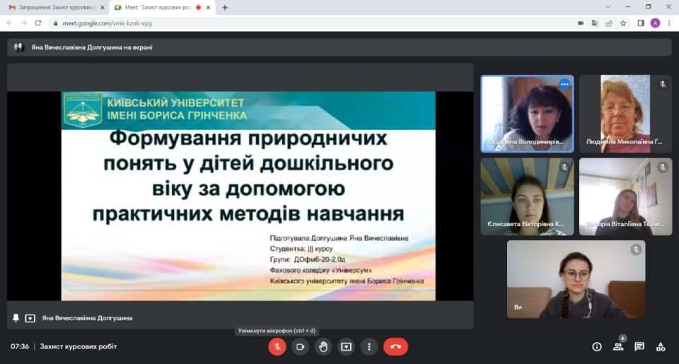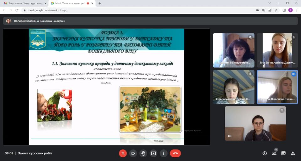21 травня 2022 р. у Фаховому коледжі «Універсум» Київського університету імені Бориса Грінченка відбувся захист курсових робіт з навчальної дисципліни: Основи природознавства і методика ознайомлення дітей з природою. Студенти 3 курсу спеціальності «Дошкільна освіта» презентували результати наукових досліджень. Захист проходив у онлайн-форматі з використанням сервісу Google Meet.