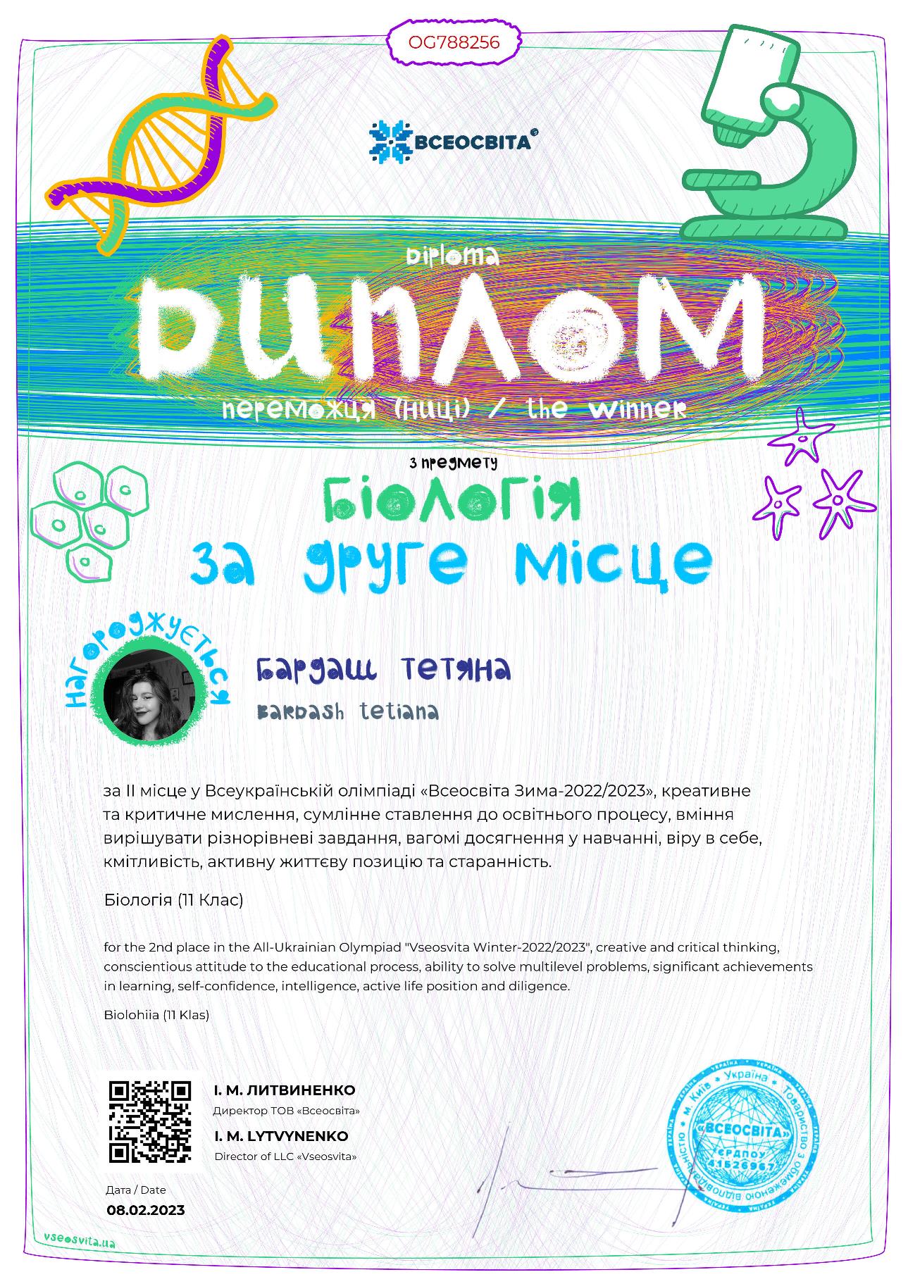 Вітаємо студентів Фахового коледжу «Універсум» Київського університету імені Бориса Грінченка, переможців Всеукраїнської онлайн олімпіади з біології «Всеосвіта- зима 2022/2023.