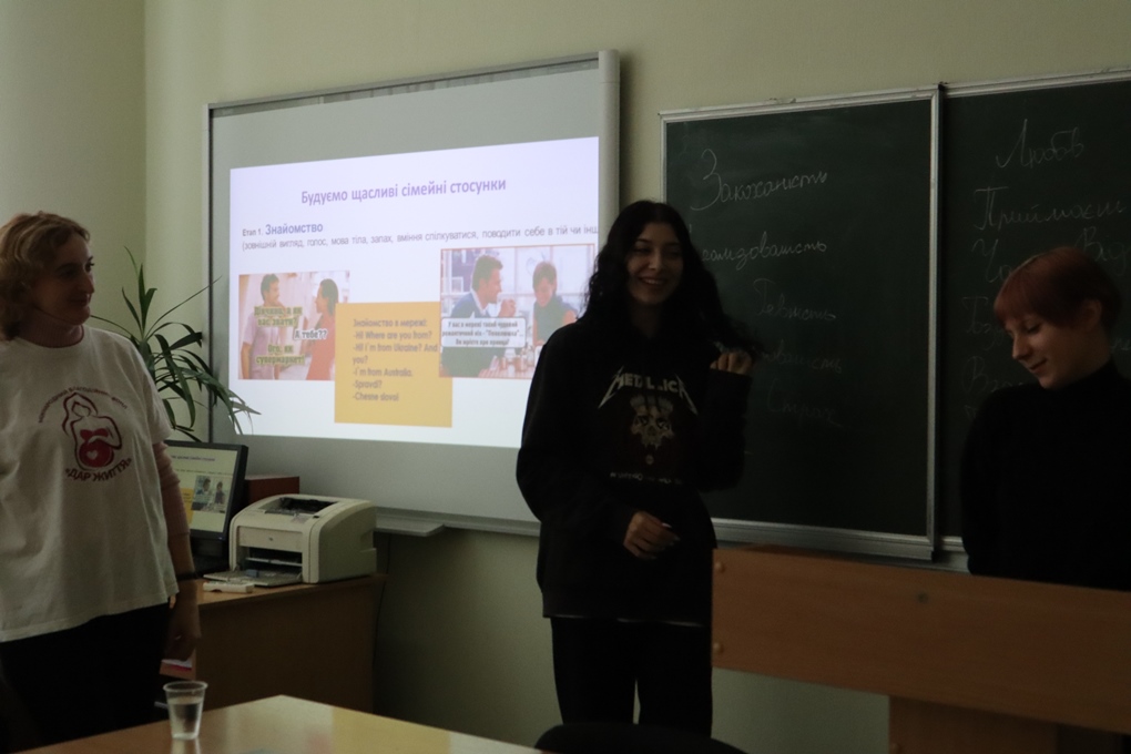 Студентам розповідали як розрізняти ці делікатні почуття, чим вони відрізняються та скільки зазвичай тривають, а також розповіли про основні критерії, які є основою для створення щасливого шлюбу. Протягом заняття студенти проявляли цікавість та активність. Зустріч завершилась виконанням тесту на тему: Чи закохана я?