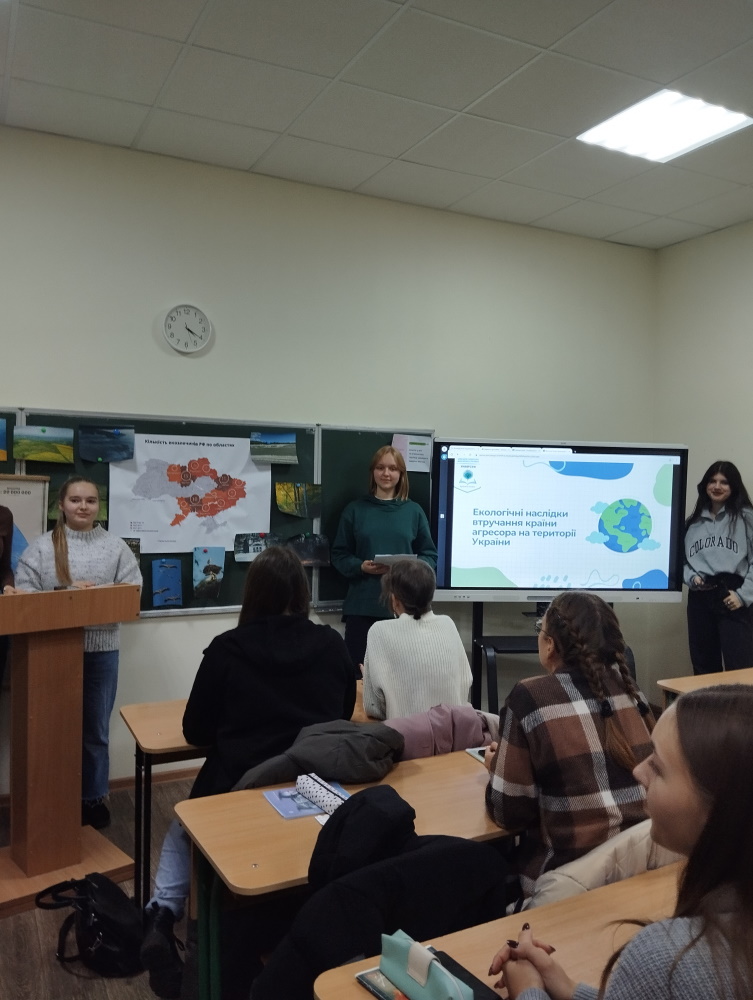 Студенти презентували свою дослідницьку роботу , в якій показали як військове вторгнення росії впливає на довкілля України: втрата біорізноманіття та загроза червонокнижним видам, пожежі в екосистемах через бойові дії, хімічне забруднення від обстрілів і ракет, забруднення ґрунтів та моря нафтопродуктами, пожежі на об’єктах промисловості та інфраструктури від обстрілів, ракетні атаки на підприємства та цивільні об’єкти, масштабні обстріли.