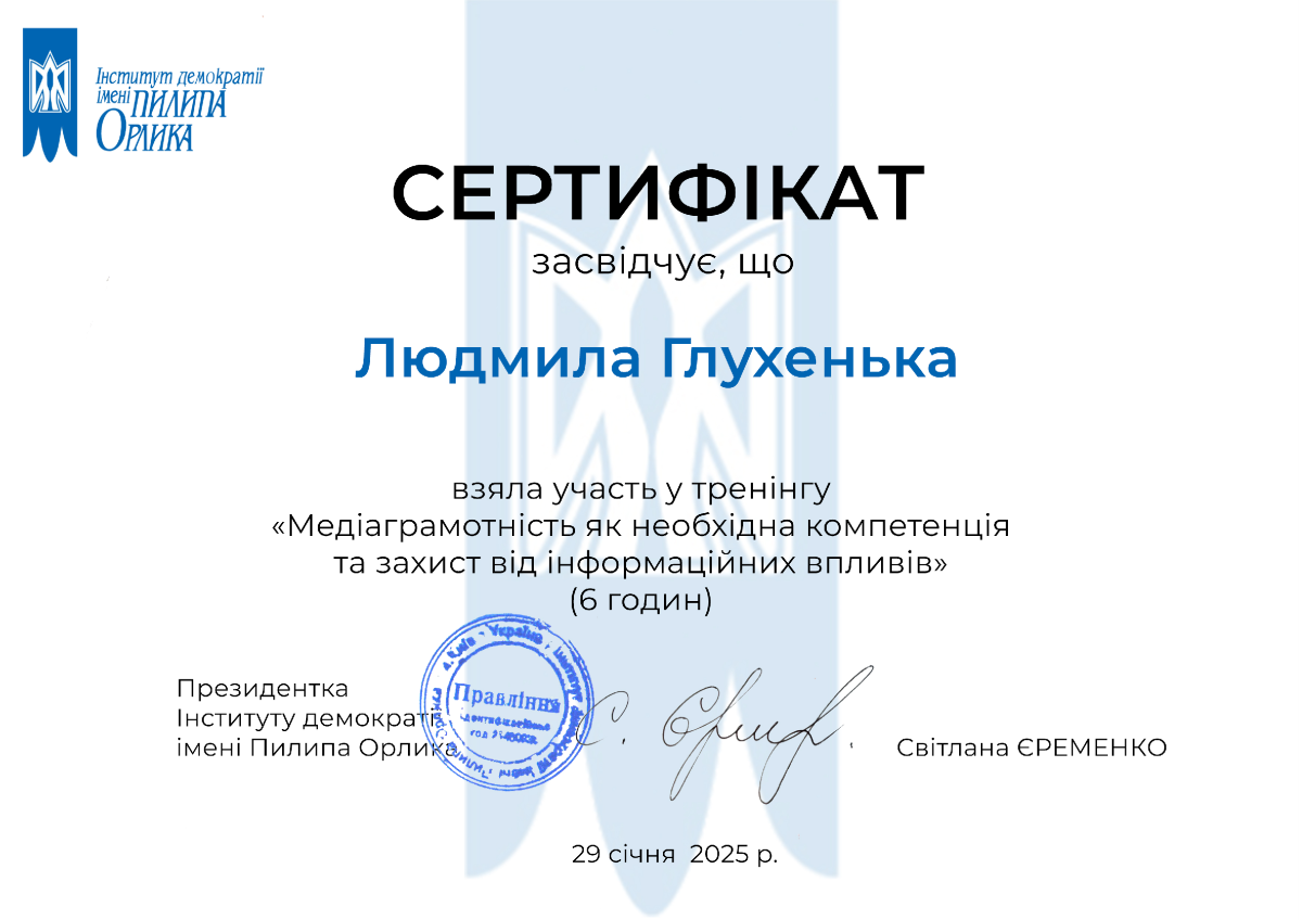 29 січня 2025 року викладачі ЦК природничих дисциплін Глухенька Л. М., Мальцева Л. В. та Варда Н. А. взяли участь в одноденному тренінгу «Медіаграмотність як необхідна компетенція та захист від інформаційних впливів», який проводила ГО «Інститут демократії імені Пилипа Орлика» (ІДПО).