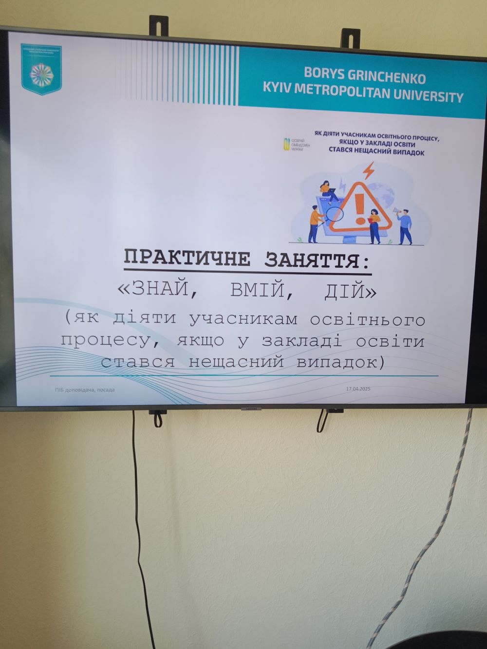 17 квітня 2025 року за участі студентів групи ПОфмб-2-24-3.0д Фахового коледжу «Універсум» Київського столичного університету імені Бориса Грінченка в межах декади природничих дисциплін було проведено практичне заняття з дисципліни «Безпека життєдіяльності, охорона праці та цивільний захист» на тему «ЗНАЙ, ВМІЙ, ДІЙ».