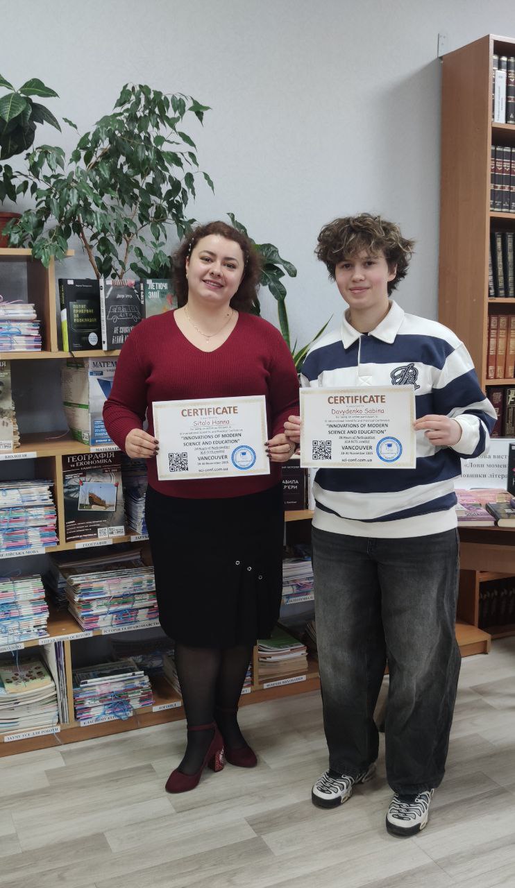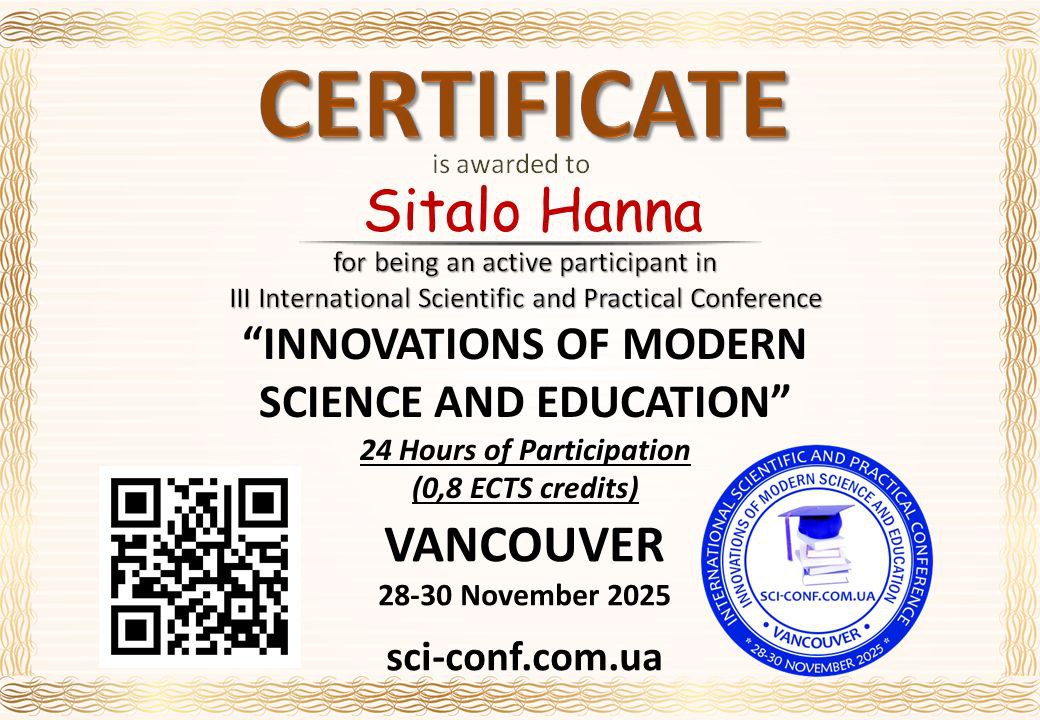 28-30.11.2025 року студентка 3 курсу спеціальності фізична культура Давиденко Сабіна та викладач циклової комісії природничих дисциплін Сітало Г.П. взяли участь у III Міжнародній науково-практичній конференції “INNOVATIONS OF MODERN SCIENCE AND EDUCATION, Ванкувер, Канада.