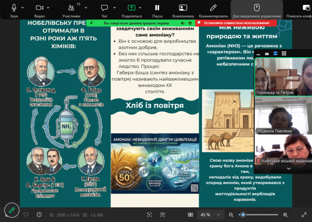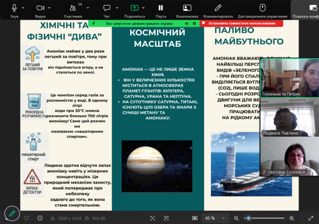 Від коледжу з презентацією проєктно-дослідницької роботи виступила Петрик Марина, тема «Амоніак - це місток між неживою природою та життям».