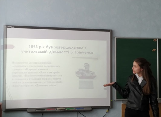 Студенти познайомились з думками, педагогічними поглядами Б. Грінченка та творами видатного освітнього діяча на педагогічну тематику. Ідеї видатного педагога знайшли своє відображення в концепції Нової української школи.