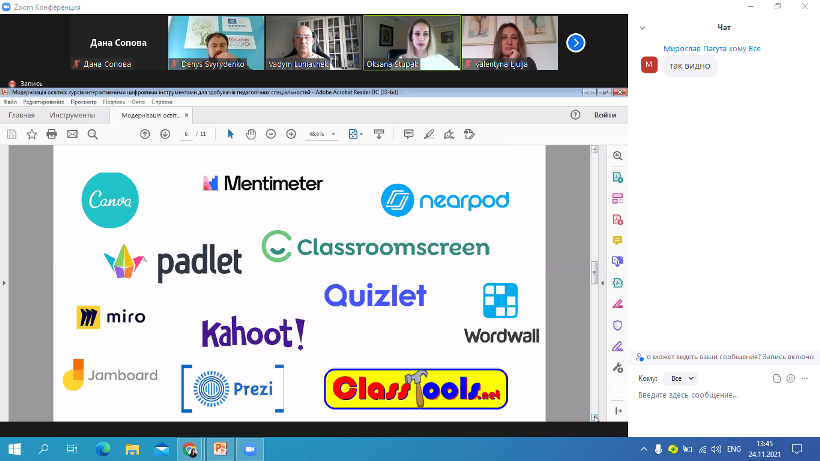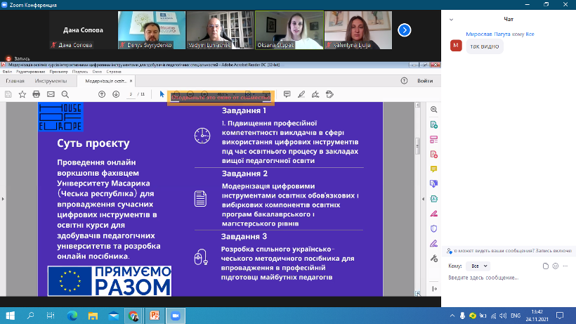 24.11.2021 р. викладач циклової комісії з педагогічної освіти Д.О. Сопова брала участь в онлайн-конференції проєкту "Зміни педагогічних факультетів для ХХІ століття". Зі вступним словом виступив В. Лавриненко, проректор з міжнародних зв'язків Національного педагогічного університету імені М.П. Драгоманова. Ленка Гулова, спеціальна асистентка кафедри соціального педагогічного факультету Університету Масарика, головна координаторка проєкту виступила з доповіддю на тему "Куди прямуєш, університете?", де висвітлила головні переспективні вектори розвитку сучасних університетів. Головними темами конференції були: інтернаціоналізація вищої освіти, як виклик для України; дискусійні питання підготовки вчителів в умовах онлайн-навчання; можливості та виклики трансдисциплінарності. Щиро дякуємо за можливість участі в міжнародній конференції!