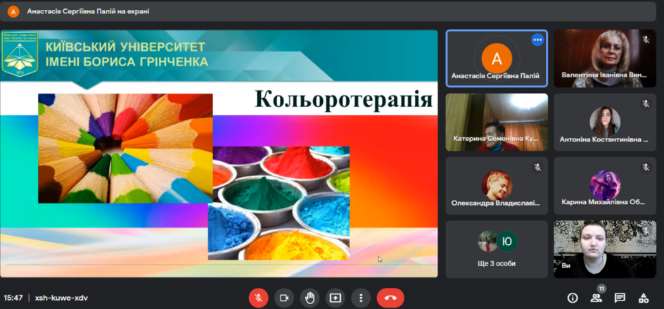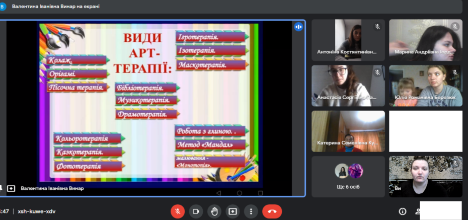 13 квітня 2022 року із студентами четвертого курсу спеціальності Соціальна педагогіка Фахового коледжу "Універсум" Київського університету імені Бориса Грінченка, разом з викладачем Винар В.І., було проведено воркшоп: "Техніки АРТ-ТЕРАПІЇ в роботі дітьми".