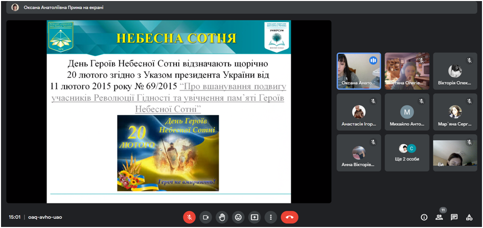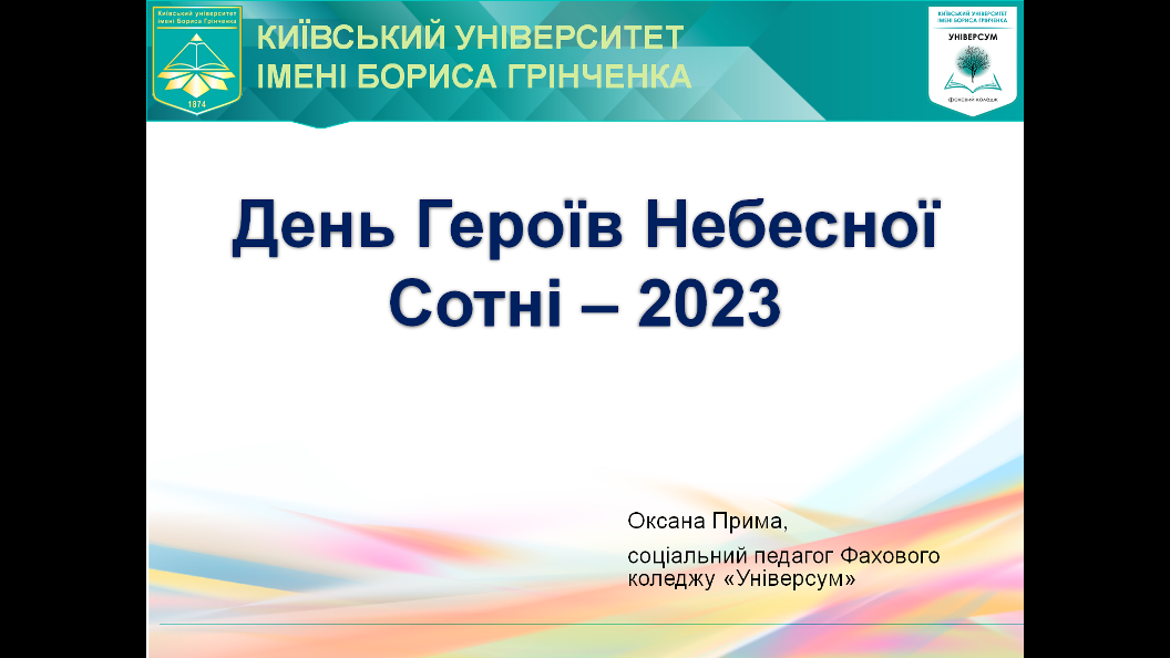 20 лютого 2023 року зі студентами ІІ та ІІІ курсів Фахового коледжу «Універсум» Київського університету імені Бориса Грінченка спеціальності «Соціальна педагогіка» були проведені онлайн зустрічі до Дня Героїв Небесної Сотні.