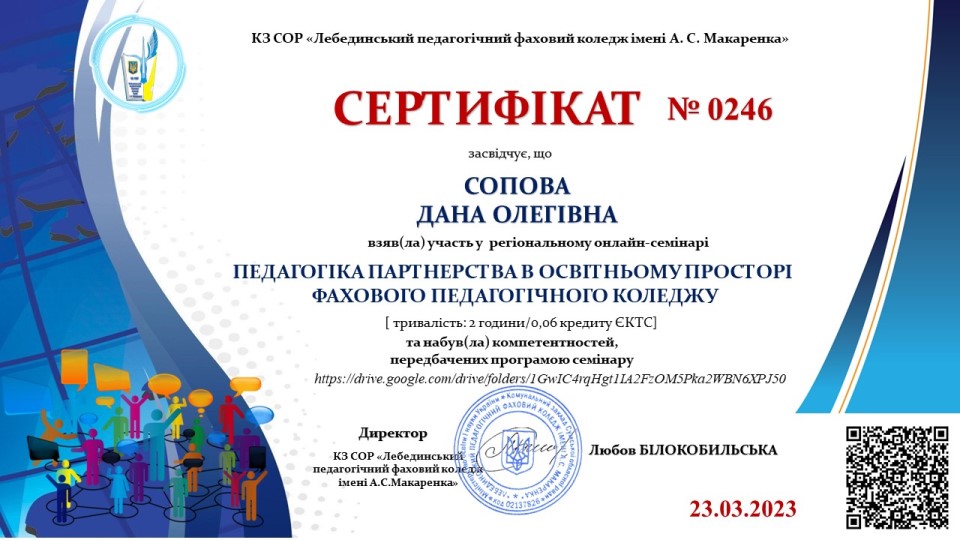23.03.2023 р. викладачі циклової комісії з педагогічної освіти Альона Олександрівна Доценко та Дана Олегівна Сопова взяли участь в онлайн-семінарі "Педагогіка партнерства в освітньому просторі фахового педагогічного коледжу", який відбувся у рамках роботи методичного об'єднання голів циклових комісій психолого-педагогічних дисциплін педагогічних ЗФПО Центрального регіону України. Д.О. Сопова виступила з доповіддю на тему "Академічна доброчесність та педагогіка партнерства: європейський досвід". Було зроблено акцент на тому, що педагогіка партнерства неможлива без довіри всіх учасниць та учасників освітнього процесу одне до одного. А доброчесність - основа довіри. Якщо людина доброчесна, то ти можеш ïй довіряти, і сам маєш бути вартим її довіри. Щиро дякуємо організаторам, Комунальний закладу Сумської обласної ради "Лебединський педагогічний фаховий коледж імені А.С. Макаренка", за можливість долучитися до наукового заходу!
