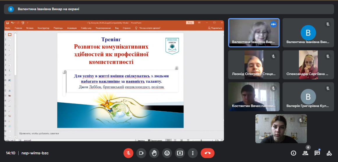 4 квітня 2023 року в рамках Декади циклової комісії з педагогічної освіти для студентів четвертого курсу спеціальності «Організація виробництва» було проведено онлайн-тренінг «Розвиток комунікативних здібностей як професійної компетентності».