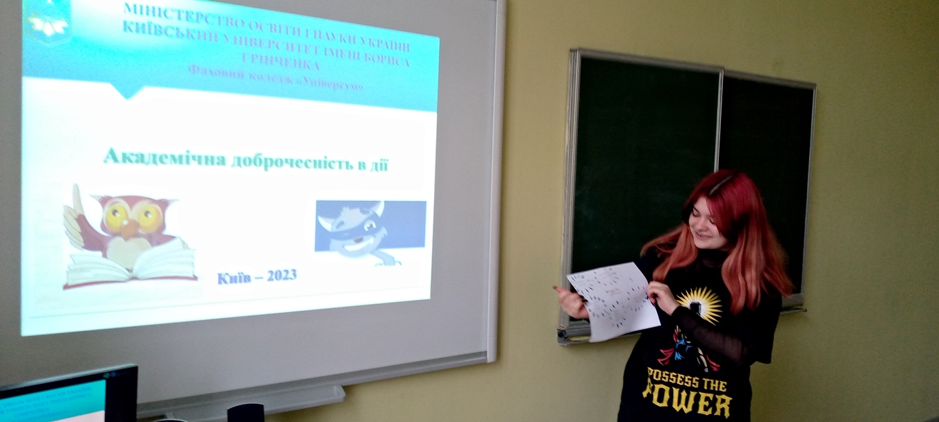 14.04.2023 р. в рамках Декади циклової комісії з педагогічної освіти та з нагоди відзначення Дня коледжу було проведено воркшоп “Академічна доброчесність в дії” для викладачів і студентів Фахового коледжу "Універсум". Учасники заходу обговорили загальні риси академічної доброчесності та етики дослідницької роботи; розглянули приклади порушень академічної доброчесності та їх наслідки; студентам були надані поради щодо того, як перевірити цитати на плагіат. Також студенти представили своє бачення дотримання принципів академічної доброчесності в освітньому процесі.