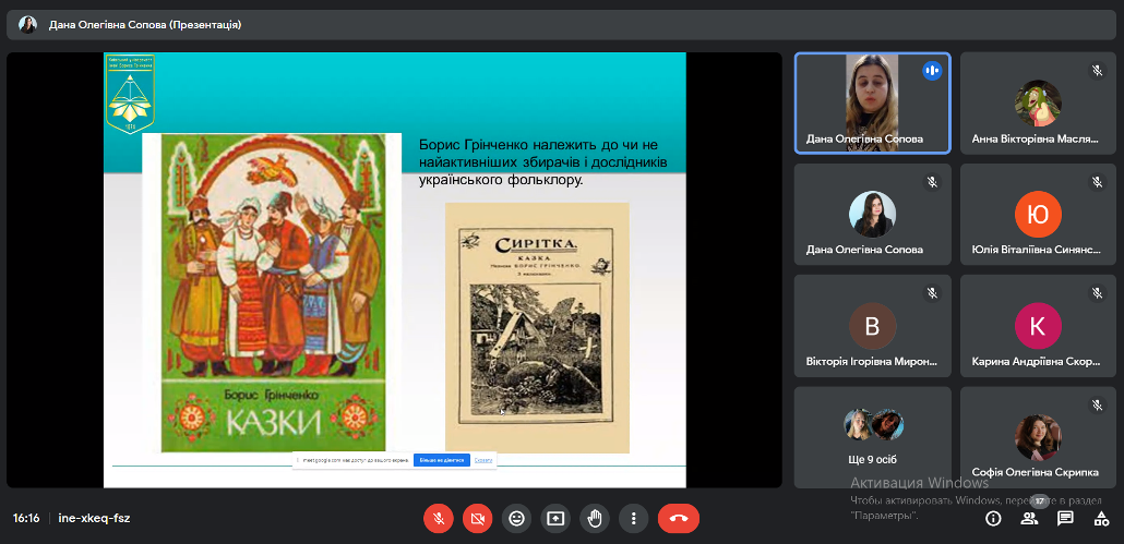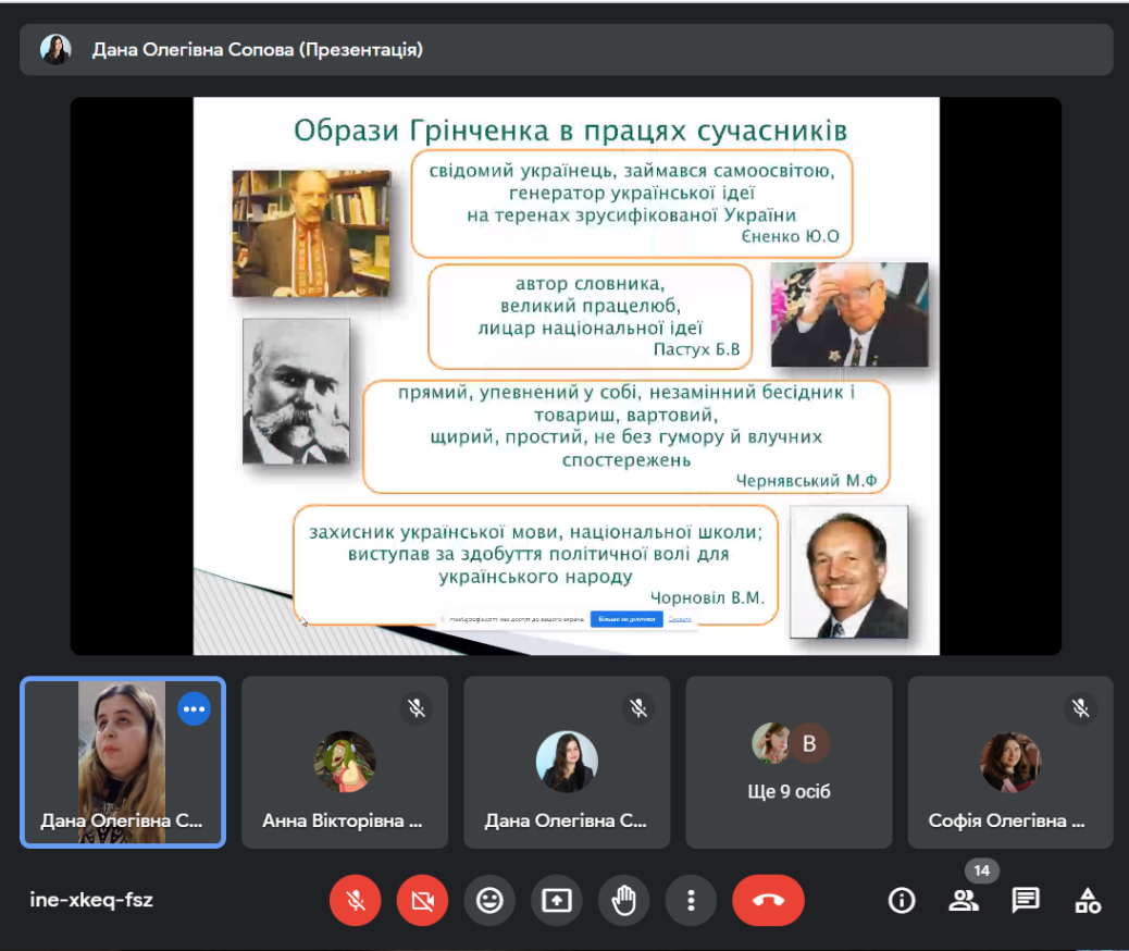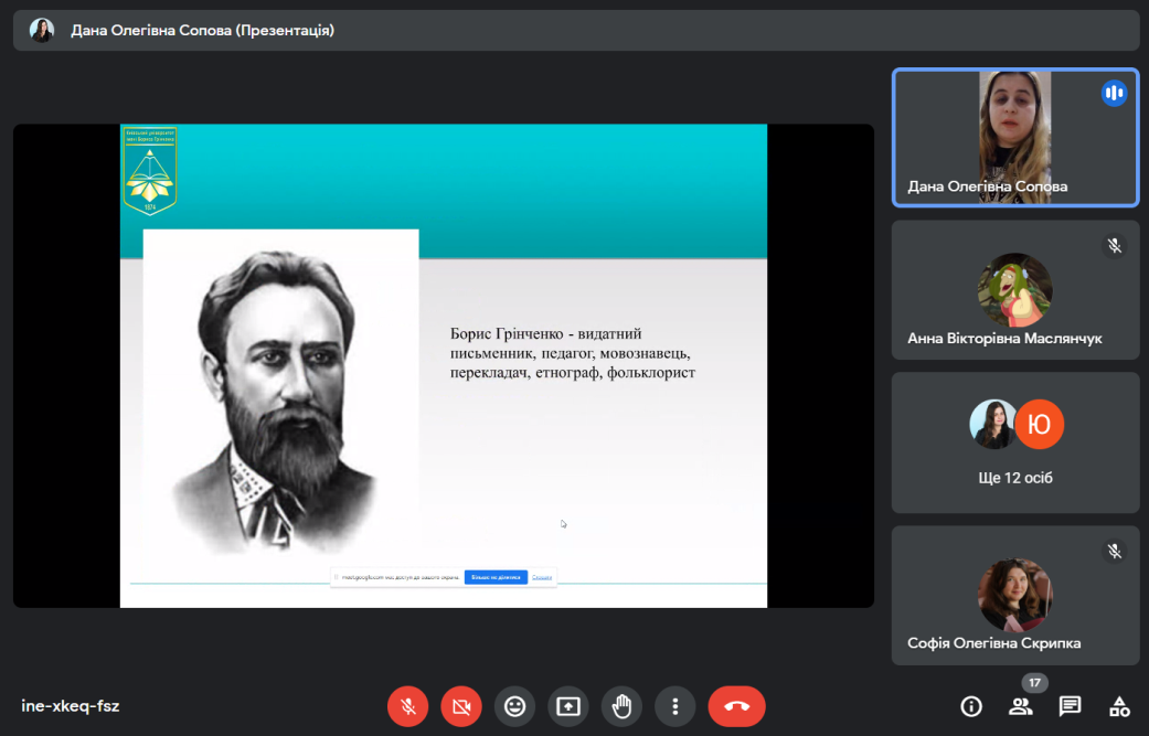 07 грудня 2023 року з нагоди Грінченківської декади було проведено вебінар «Аналіз впливу казок Бориса Грінченка на духовний розвиток молоді» для студентів спеціальностей «Початкова освіта» та «Дошкільна освіта». Борис Дмитрович Грінченко у своїх казках особливо підносить почуття людської гідності героїв, зумовлене чесною працею, шанобливо ставиться до народної мудрості. У казках Бориса Дмитровича Грінченка закладений повчальний зміст. Хвалькуватість, підлесливість, боягузтво, зазнайство автор висвітлює як найбридкіші риси в людині, адже казка повинна навчити чесності, порядності в житті. Розмаїття Грінченкових легенд та казок дає змогу малому читачеві поринути у чарівний світ, де зло не лишається непокараним, а добро – винагородженим.