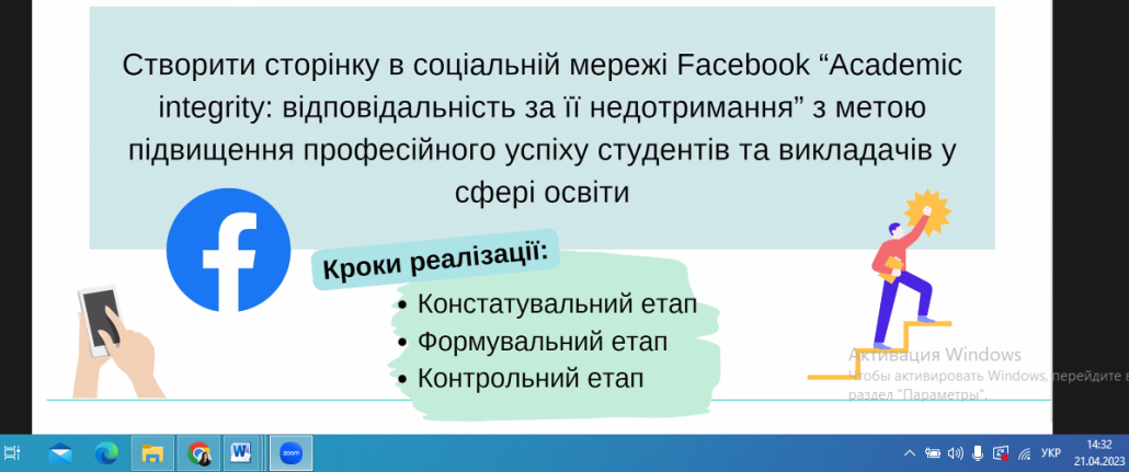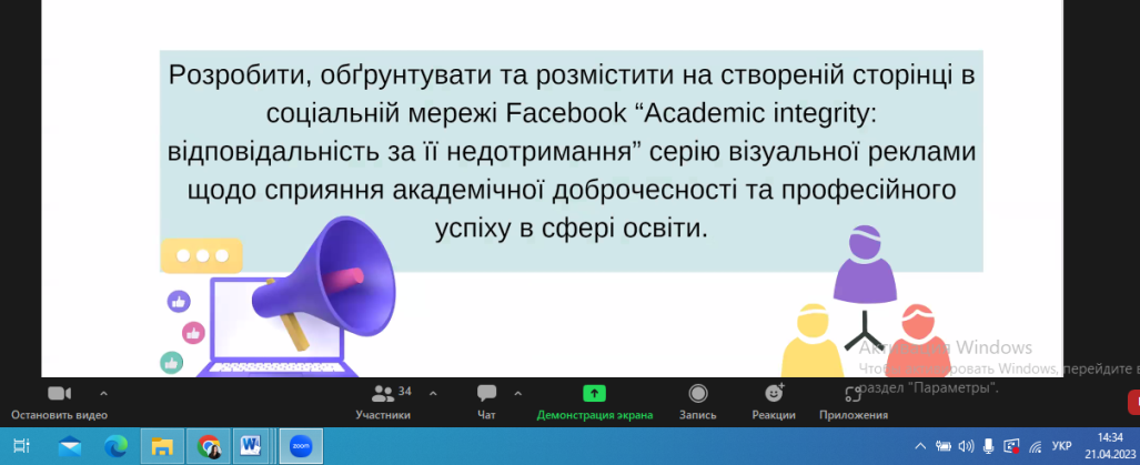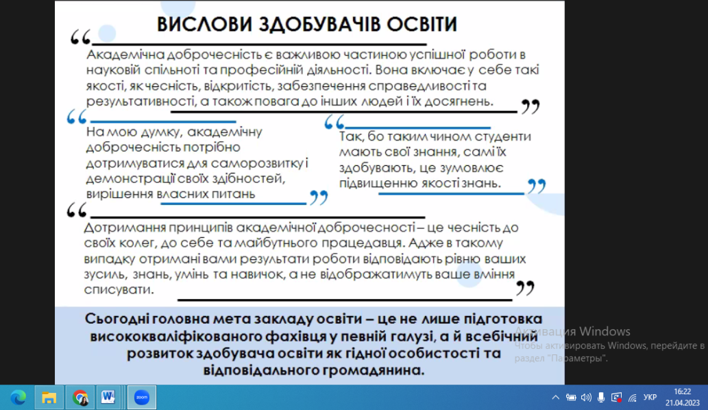 21 квітня 2023 року було проведено вебінар «Шляхи популяризації академічної доброчесності серед здобувачів фахової перед вищої освіти» для студентів та викладачів Фахового коледжу «Універсум». Захід був спрямований на вивчення стратегій та методів підвищення рівня етичності в академічному середовищі. Учасники дізналися, як створити стимулюючу атмосферу для дотримання етичних норм та уникнення плагіату. В рамках вебінару було розглянуто практичні приклади та кейси, а також висвітлені інструменти, які сприяють формуванню культури академічної доброчесності. Учасники отримали корисні поради щодо виявлення та запобігання порушенням етичних стандартів в галузі фахової перед вищої освіти.