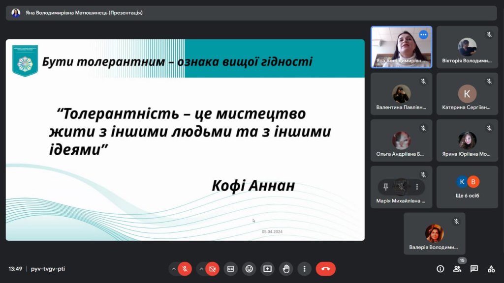 Мета заходу – сприяти усвідомленню студентами сутності поняття «толерантність», виявити основні риси толерантності, розширити уявлення студентів про толерантну поведінку та необхідність толерантного ставлення до оточуючих у різних життєвих ситуаціях, розвивати здатність до емпатії та вміння вирішувати конфлікти мирним шляхом і знаходити компроміс. Під час заходу учасники вебінару мали змогу ознайомитись з поняттям «толерантність» та його ознаками, особливостями прояву толерантності, терпимості, розуміння індивідуальності кожної особистості та почуття відповідальності за свої вчинки.