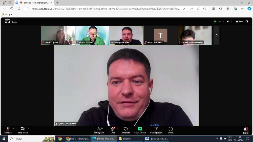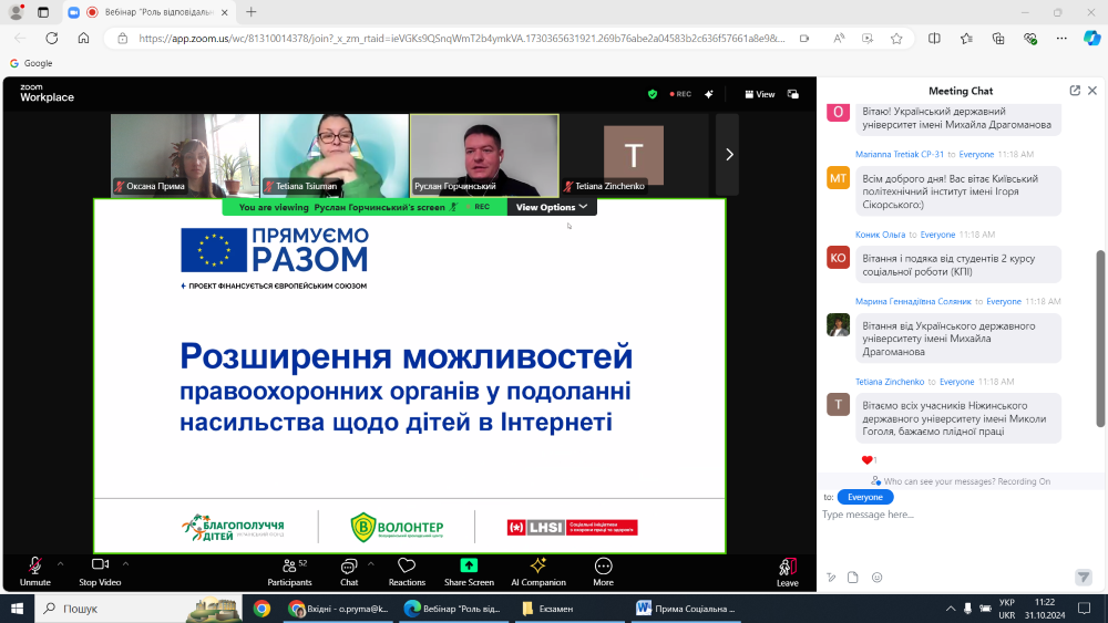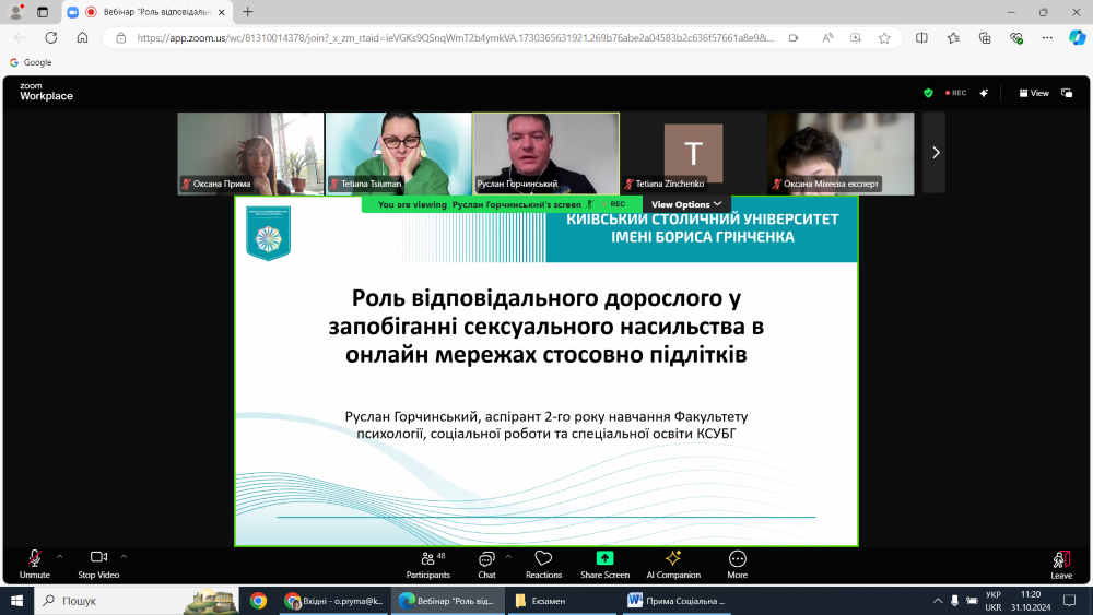 31 жовтня 2024 р. соціальний педагог Фахового коледжу «Універсум», викладач циклової комісії з педагогічної освіти Оксана Прима взяла участь у вебінарі на тему «Роль відповідального дорослого у запобіганні сексуальному насильству в онлайн мережах стосовно підлітків». Захід був організований кафедрою соціальної педагогіки та соціальної роботи Факультету психології, соціальної роботи та спеціальної освіти Київського столичного університету імені Бориса Грінченка.