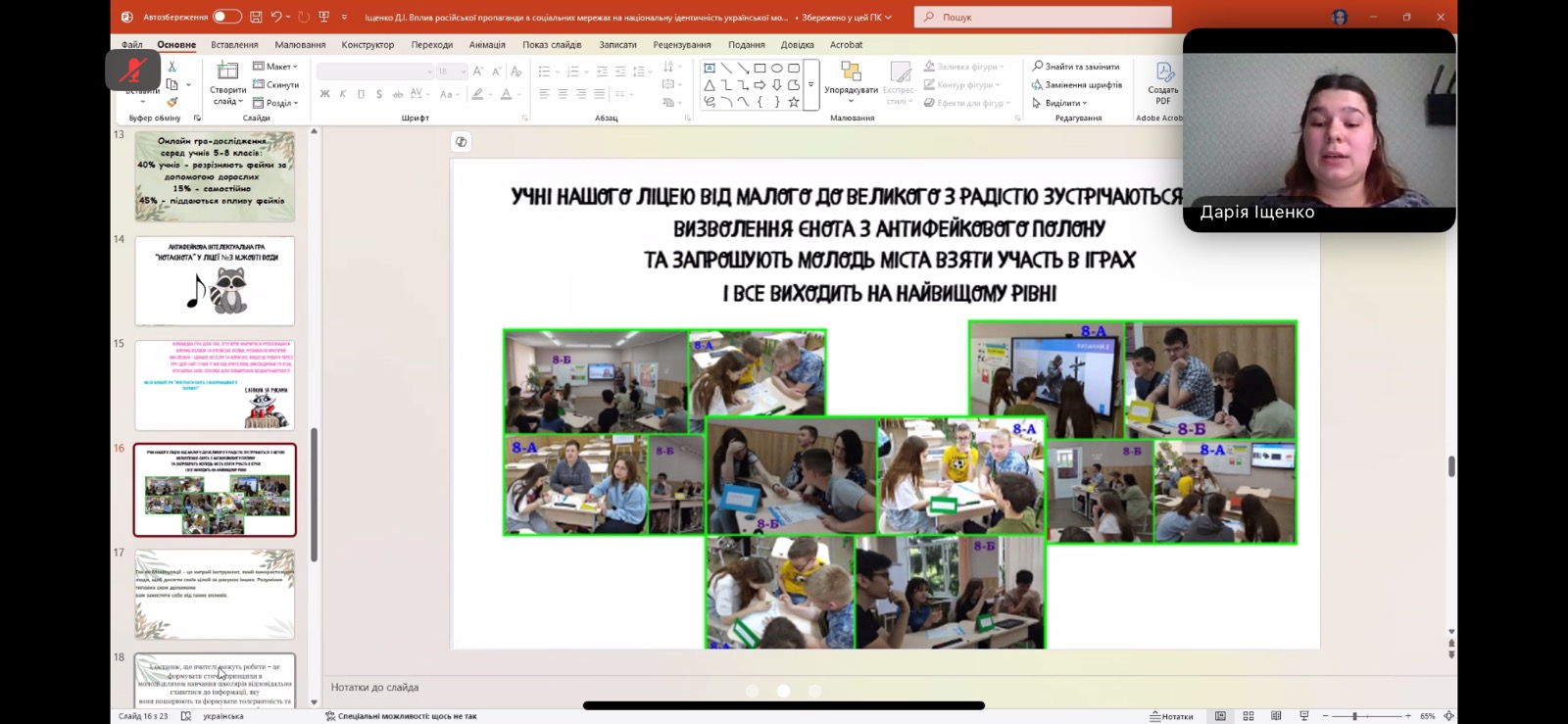 03 квітня 2025 року в рамках декади циклової комісії з педагогічної освіти студенти 4 курсу спеціальності 231 Соціальна робота взяли участь у секційному засіданні методологічного семінару «Стратегічні орієнтири та інноваційні практики утвердження української національної ідентичності в умовах воєнного стану» (Секція 5. Вплив медіа та соцмереж на національну ідентичність молоді).