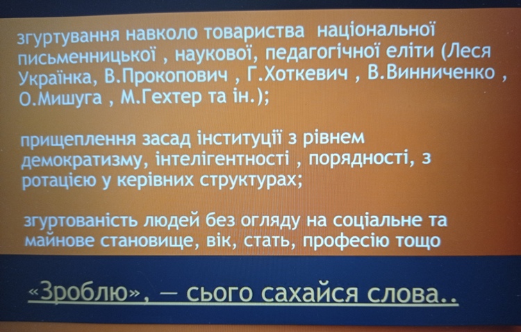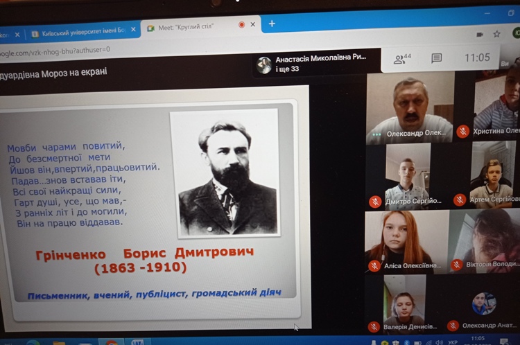 Студенти групи ОВфмб-1-20-4.0д виступили з повідомленнями про життєвий, творчий шлях письменника. Значна увага була приділена політичним поглядам, цінностям Бориса Грінченка, що формувалися в складний період українського державотворення. Студенти разом з модератором заходу викладачем ЦК суспільних дисциплін та правознавства к.і.н.Казаковим О.О. аналізували історичні процеси та події української історії к. ХІХ - п. ХХ ст., що вплинули на формування політичної ідеології видатного письменника та громадського діяча.
