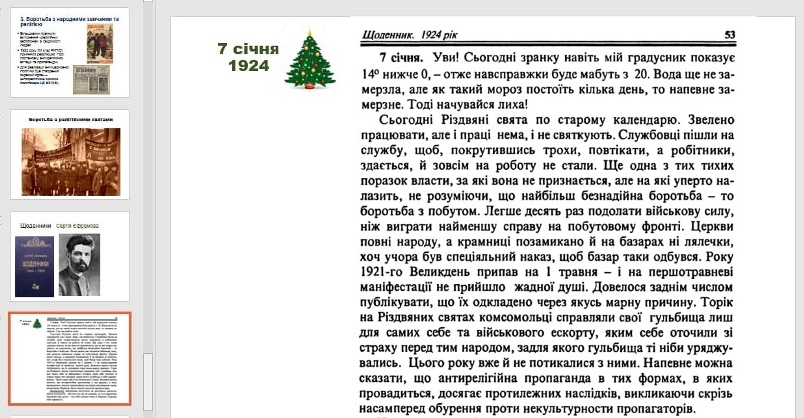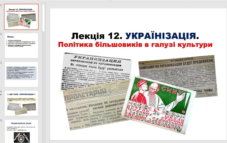 16 грудня 2020 року в рамках декади циклової комісії суспільних дисциплін і правознавства відбулася відкрита пара викладачки МусіяченкоО.С., присвячена темі радянської українізації 1920-х. Студенти 1 курсу спеціальності "Право" аналізували епоху, використовуючи різні види історичних джерел: нормативно-правові акти, щоденники, твори художньої літератури. Заняття було проведено за допомогою моделі змішаного навчання «перевернутий клас».