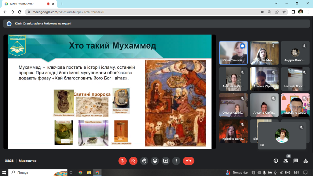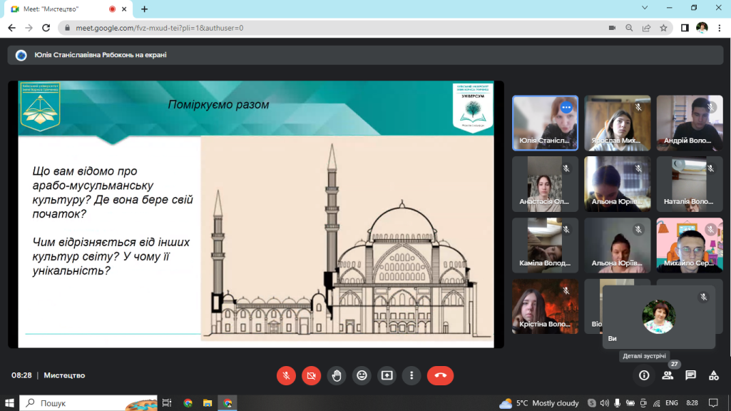 22 березня 2023 року в Фаховому коледжі "Універсум" Київського університету імені Бориса Грінченка в групі 1 курсу спеціальності "Право" викладач циклової комісії суспільних дисциплін і правознавства Рябоконь Юлія Станіславівна провела відкрите заняття з дисципліни "Мистецтво" на тему: "Мистецтво арабо-мусульманського культурного регіону".