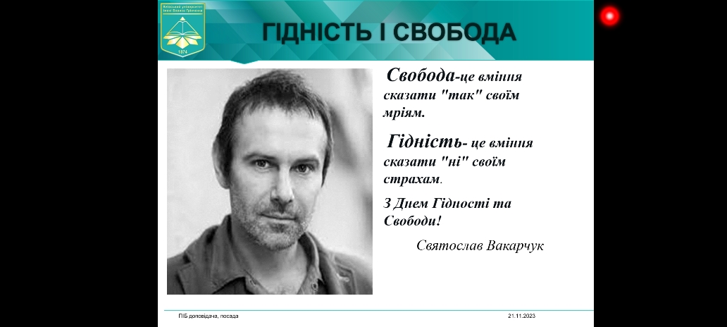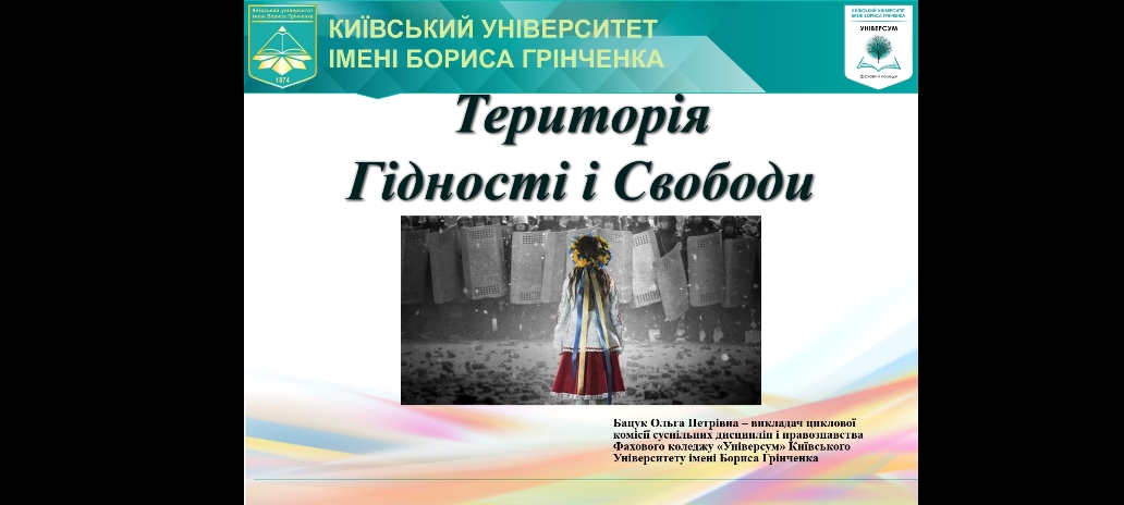 21 листопада 2023 року в Фаховому коледжі «Універсум» Київського університету імені Бориса Грінченка до Дня гідності і свободи в групі СПфмб-1-23-3.0д було проведено виховний захід на тему «Територія гідності і свободи». Студенти ознайомились з історією відзначення свята та хронологією боротьби українського народу за свою свободу, гідність та європейський вибір від Помаранчевої революції та Революції Гідності до російсько-української війни сьогодні. Український народ як демонстрував, так і демонструє всьому світу, що готовий боротися за своє цивілізоване європейське майбутнє та те, що Україна – є територією гідності і свободи! На підсумок, всі присутні на заході створили «Дерево Гідності і Свободи».