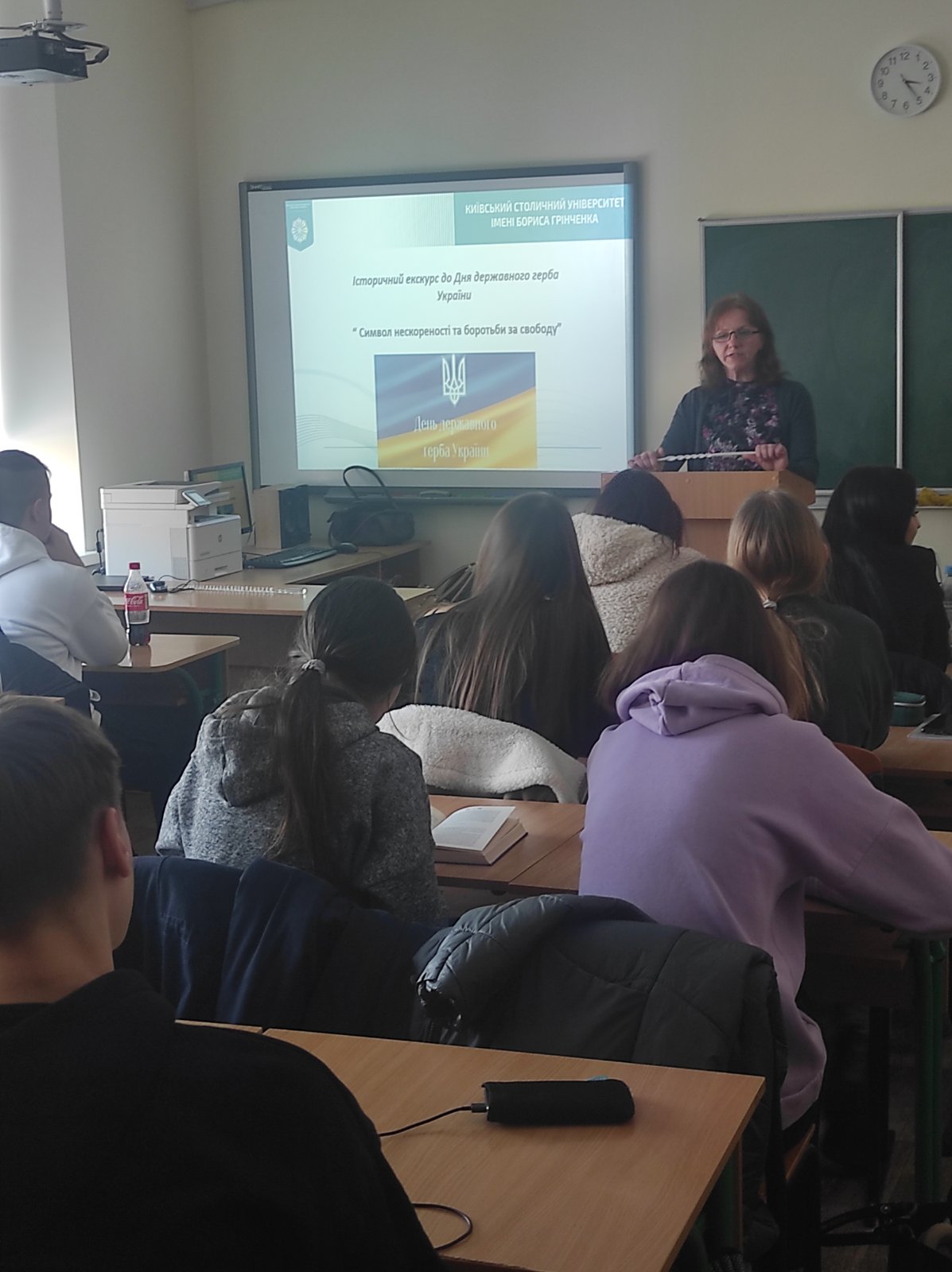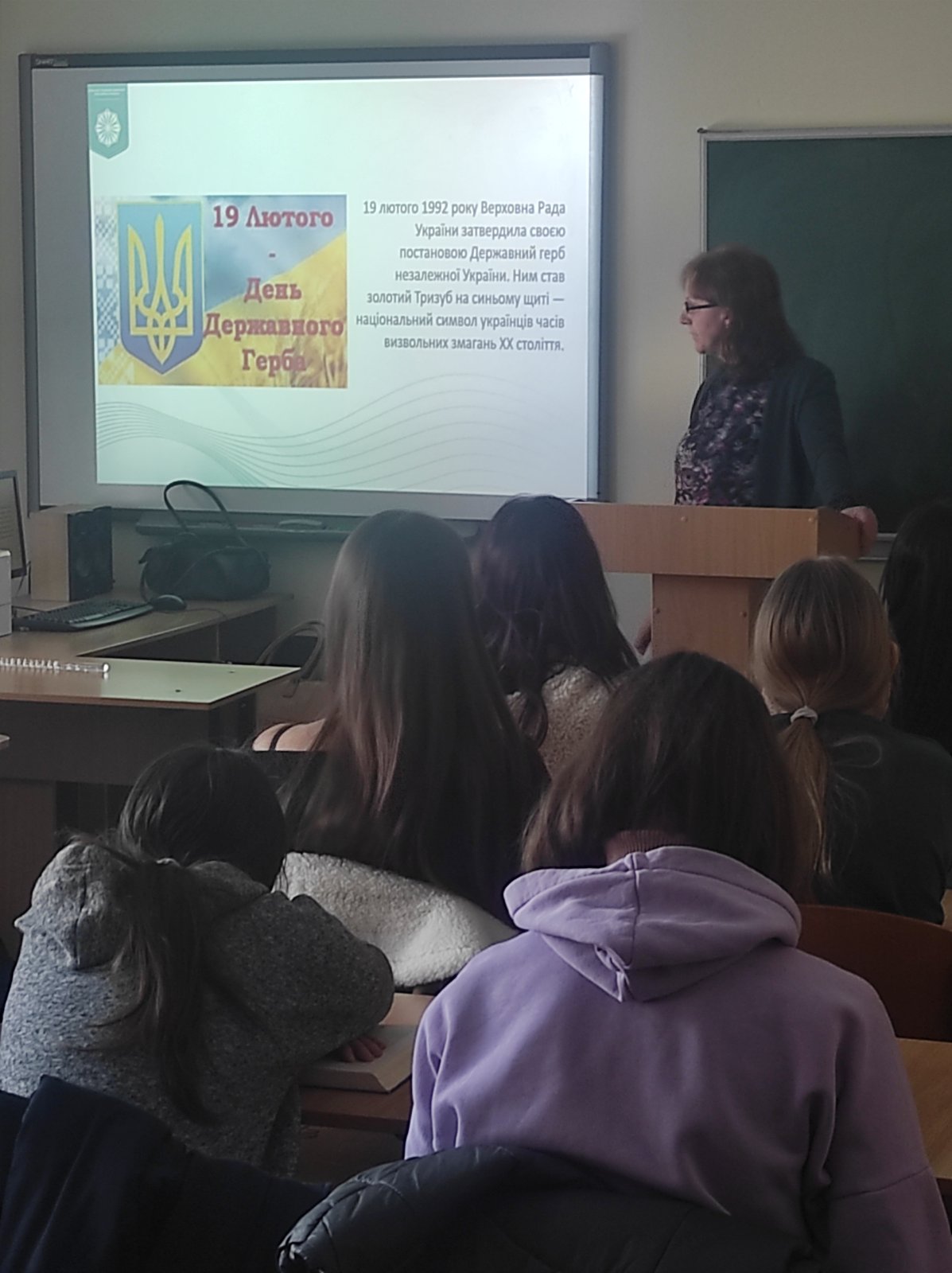 19 лютого 2025 року в рамках декади педагогічної майстерності циклової комісії суспільних дисциплін і правознавства Фахового коледжу "Універсум" викладач Юлія РЯБОКОНЬ в групах ОВфмб-1-23-3.5д та СПфмб-1-23-3.0д провела історичний екскурс до Дня державного герба України "Символ нескореності та боротьби за свободу". Студенти та викладачі мали можливість простежити еволюцію державного символу від часів Русі до сьогодення. Ознайомилися із зображенням Тризуба в інтерпретації Василя Кричевського, Георгія Нарбута, Павла Ковжуна, Андрія Гречила, Івана Турецького, Олексія Кохана та ін. Головним висновком для учасників заходу стало усвідомлення, що здавна Тризуб виступає як символ нескореності та боротьби українського народу за свободу. Цей символ є об'єднувальним елементом для українських патріотів, які віддано захищають наш суверенітет і територіальну цілісність України.