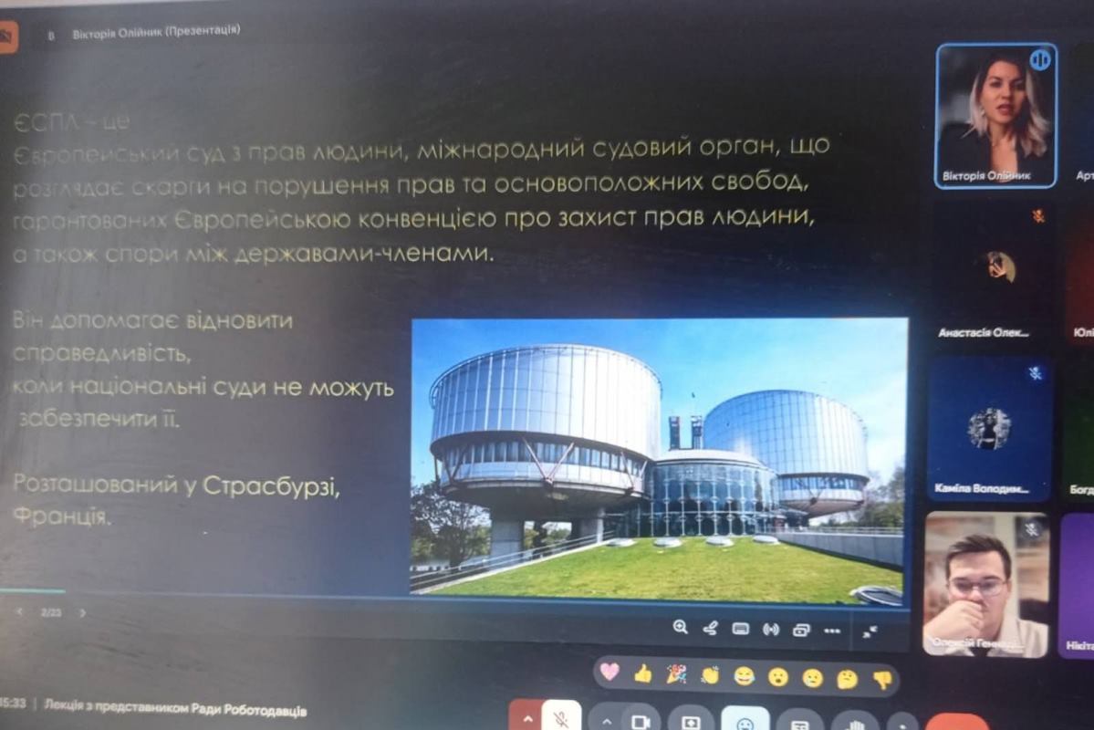 Лекторка ознайомила студентів з завданнями та функціями ЄСПЛ та пояснила механізм розгляду заяв і роль Конвенції про захист прав людини і основоположних прав, обов'язковості рішень ЄСПЛ для України.