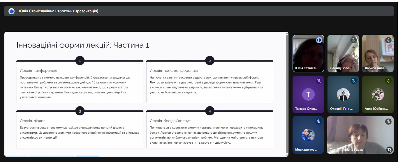 З доповідями про основні види та форми занять в фаховій передвищій освіті виступили: Рябоконь Юлія Станіславівна, Казаков Олександр Олексійович, Бацук Ольга Петрівна, Лім Лариса Анатоліївна - викладачі циклової комісії суспільних дисциплін і правознавства.