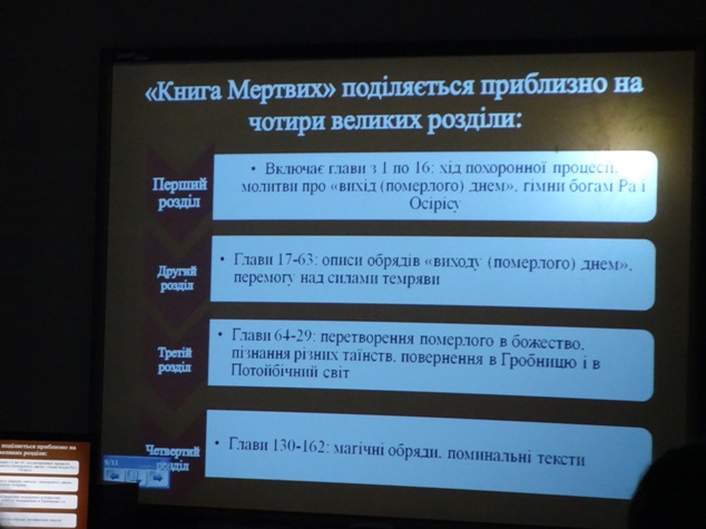 Предметом обговорення стали різноманітні прояви єгипетської словесності, які ми можемо спостерігати у сучасній світовій літературі та культурі. Особливу увагу студенти звернули на «Книгу мертвих» як найдавніший релігійний текст світу.