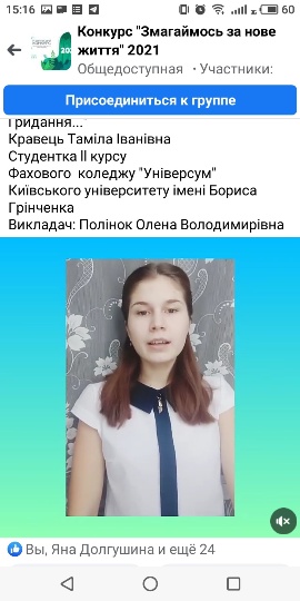 Студентки Фахового колежду «Універсум» Київського університету імені Бориса Грінченка, Кравець Таміла Іванівна (група ДОмс-1-19-3.0д та Синянська Юлія Віталіївна(група ПОфмб-1-20-4.0д), взяли участь у Всеукраїнському (ХVІІ Всекримському) фестивалі-конкурсі учнівської та студентської творчості імені Марії Фішер-Слиж «Змагаймось за нове життя!», присвяченому Лесі Українці.