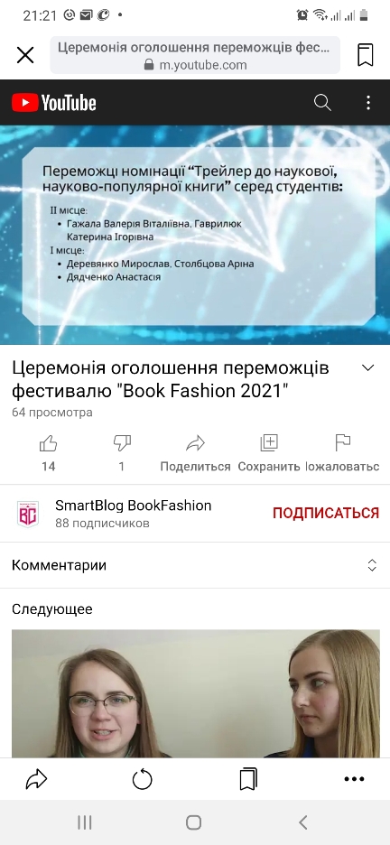 5 травня 2021 р. була проведена церемонія нагородження переможців VII Всеукраїнського фестивалю буктрейлерів Book fashion.