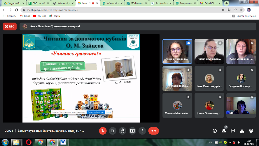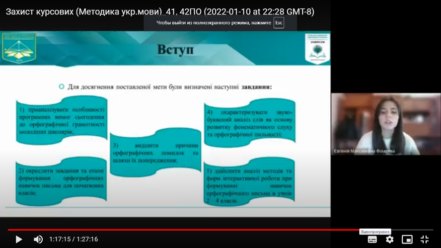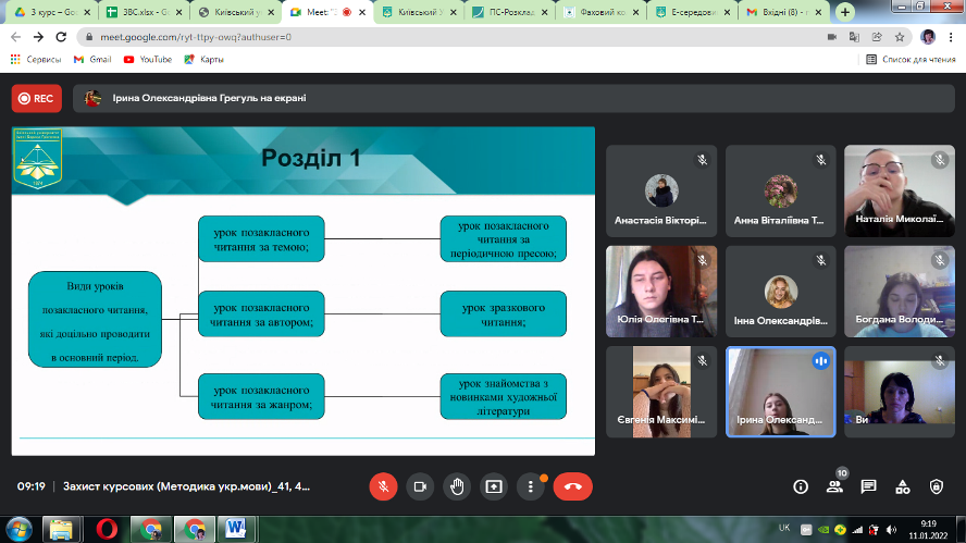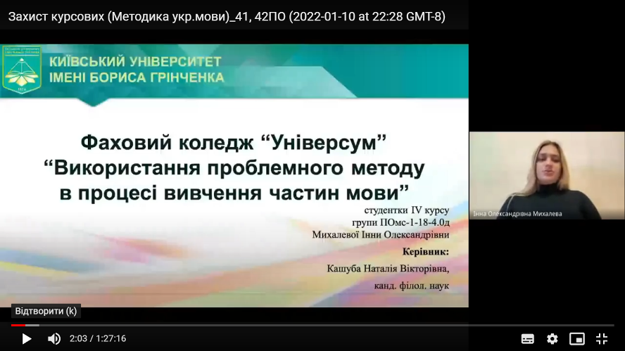 11.01.22 р. у Фаховому коледжі «Універсум» відбувся захист курсових робіт з методики навчання української мови. Студенти 4 курсу спеціальності «Початкова освіта» презентували результати наукових досліджень. Захист проходив у онлайн-форматі з використанням сервісу Google Meet.