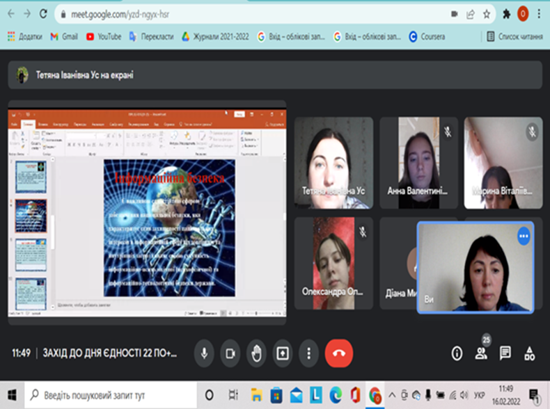 16.02.2022 р. для груп ПОфмб-2-20-4.0д та ДОмс-1-19-3.0д проведено виховну годину «Сучасні інформаційні війни в інтернет-просторі» (на тлі загострення відносин між Росією і Україною), присвячену Дню єднання. На заході розглянуто й проаналізовано форми сучасних інформаційних війн, а саме створення країною-агресором атмосфери бездуховності й аморальності, негативного ставлення до культурної спадщини нашої країни; маніпулювання суспільною свідомістю соціальних груп населення країни з метою створення політичної напруженості та хаосу; дезінформація населення про роботу державних органів та ін.