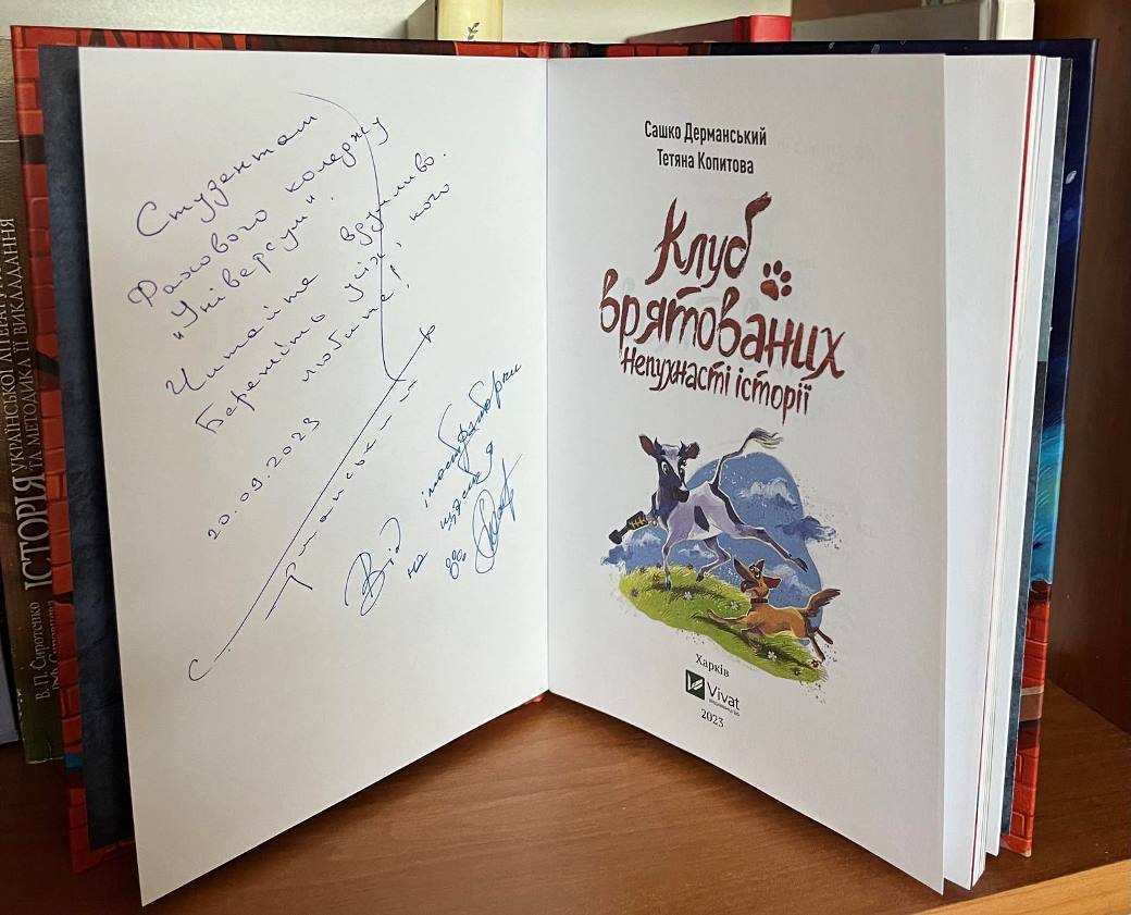 20.09.2023 року для студентів 21ПО групи було організоване виїзне заняття з дитячої літератури з методикою навчання на тему «Жанрова специфіка української дитячої літератури новітнього періоду». Студенти відвідали виставку ілюстрацій Тетяни Копитової до дитячої книжки « Клуб врятованих. Непухнасті історії» Олександра Дерманського. Учасники виставки мали змогу поспілкуватися з автором та ілюстратором. Щемливі історії та неймовірні ілюстрації з цієї книги не залишили нікого байдужими.