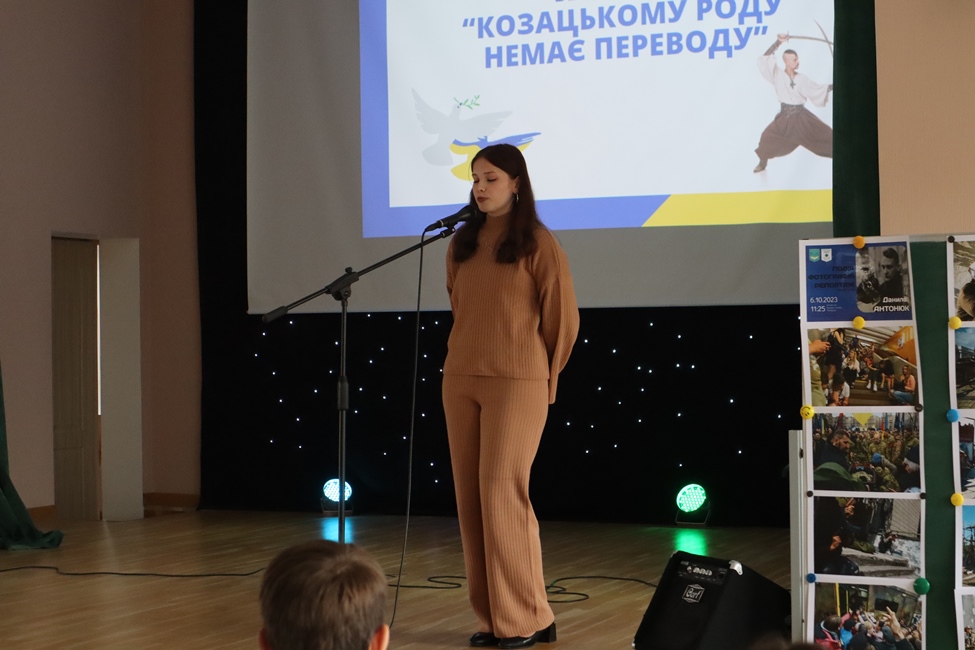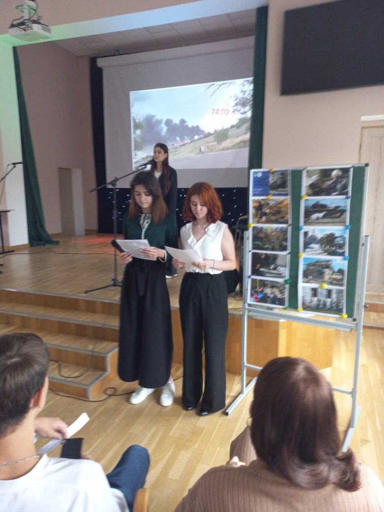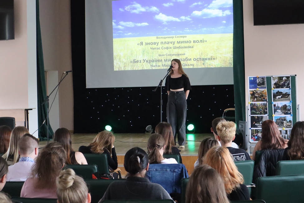 Затамувавши подих, студенти вслухалися в слова ведучих: «Не вірила, не могла осягнути істину, що стану дитиною війни. Що мирне небо України скресатимуть заграви вогнищ, тисячі, десятки тисяч вбитих, поранених, спалені міста, села. І на захист, як сотні років тому, стануть козаки, але в формі ЗСУ».