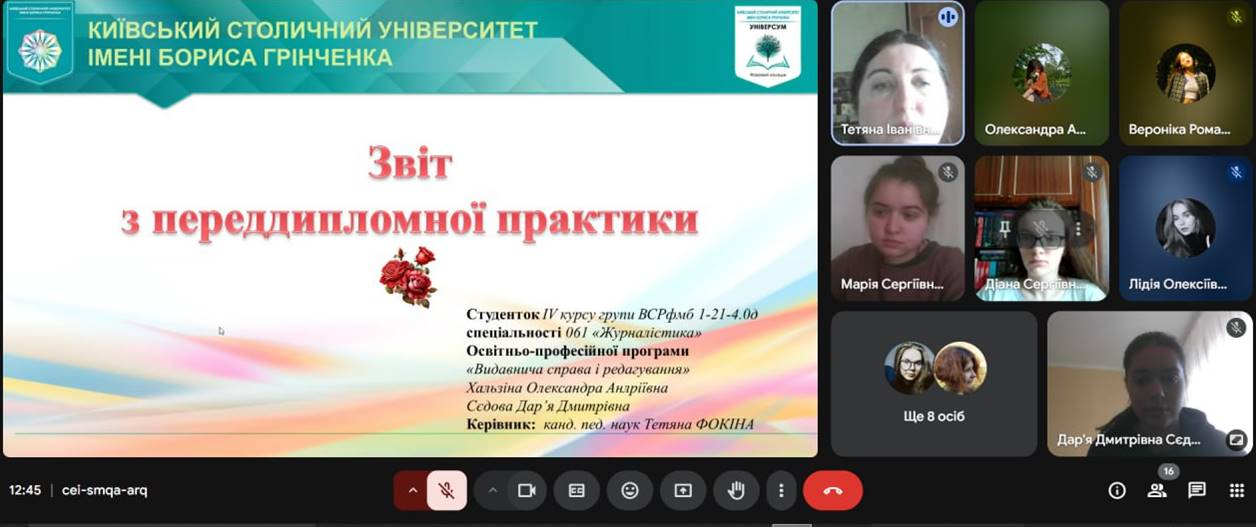 14 травня 2025 року відбулася звітна конференція з переддипломної практики групи ВСРфмб-1-21-4.0д спеціальності «Журналістика», яка тривала з 07.04.25 до 04.05.25. Переддипломна практика є важливою складовою навчального процесу, вона дала можливість майбутнім фахівцям закріпити здобуті знання на практиці та ознайомитися з реальними умовами роботи в медіа. Під час проходження практики студенти працювали у редакціях газет, онлайн-видань, телекомпаній. Вони мали змогу готувати інформаційні матеріали, брати інтерв’ю, писати репортажі та брати участь у редакційних нарадах. Практика сприяла формуванню професійних навичок, відповідальності та креативності. Після завершення практики відбувся захист звітів, де студенти поділилися своїми здобутками та досвідом. Комісія відзначила високий рівень підготовки та зацікавленість студентів у професійній діяльності. Практика стала важливим кроком до становлення кожного студента як журналіста. Вона також дала можливість налагодити зв’язки з майбутніми роботодавцями та отримати корисні поради від професіоналів галузі.
