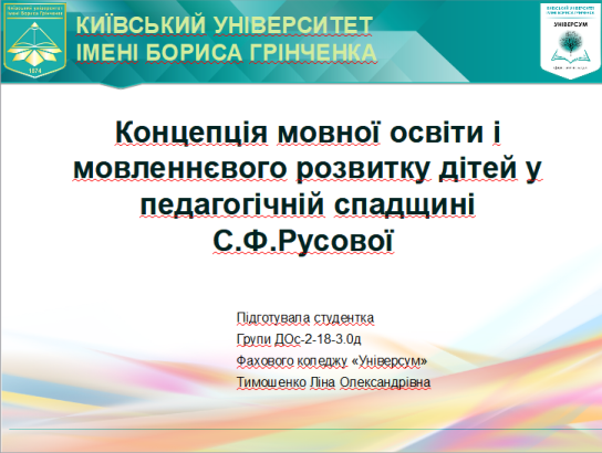 Доповідь на тему "Концепція мовної освіти і мовленнєвого розвитку дітей у педагогічній спадщині С.Ф.Русової"