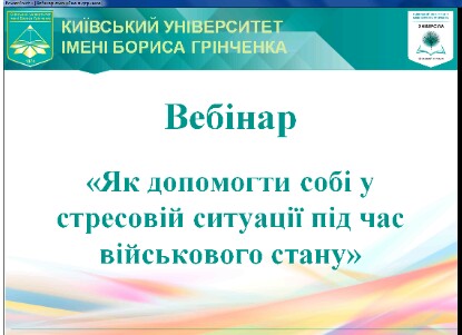 21 квітня 2022 року у Фаховому коледжі «Універсум» Київського університету імені Бориса Грінченка для студентів групи ОВфмб-1-21-4.0д в рамках декади ЦК природничих дисциплін з метою підтримки психологічного здоров’я студентів, відбувся вебінар на тему: «Як допомогти собі у стресовій ситуації під час військового часу?».