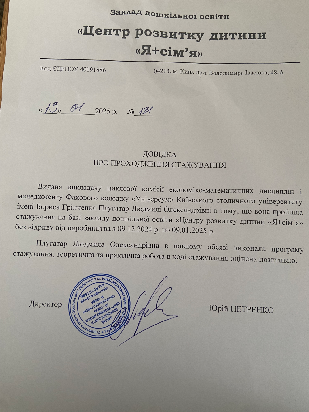 Проходження стажування на базі закладу дошкільної освіти «Центр розвитку дитини «Я+сім’я»