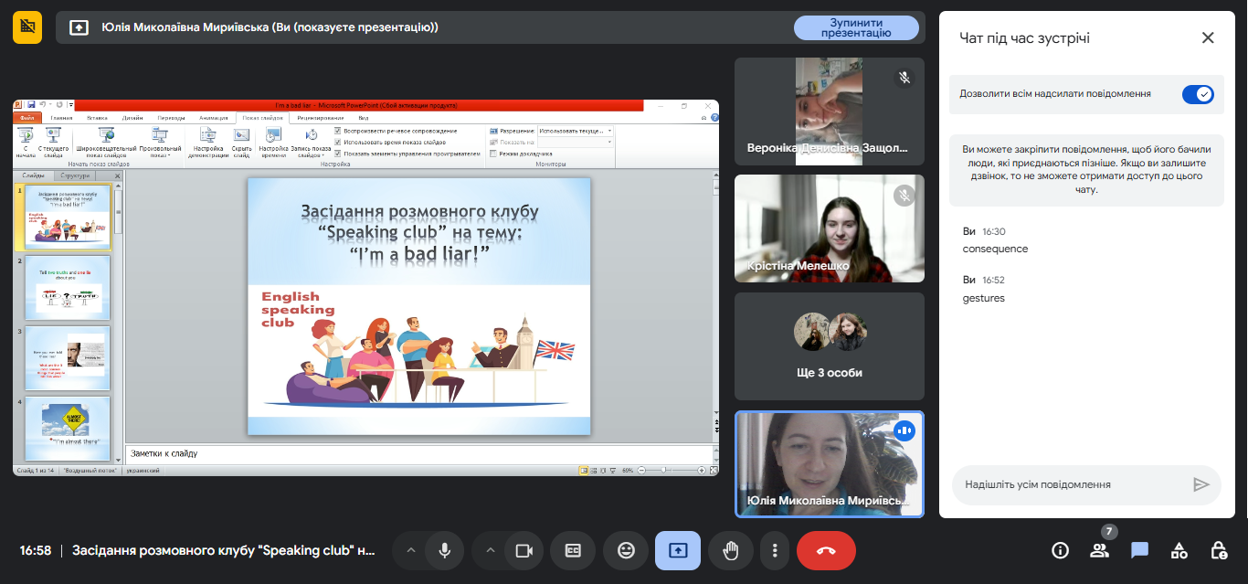 Засідання розмовного клубу "Speaking club" на тему "I'm a bad liar!"
